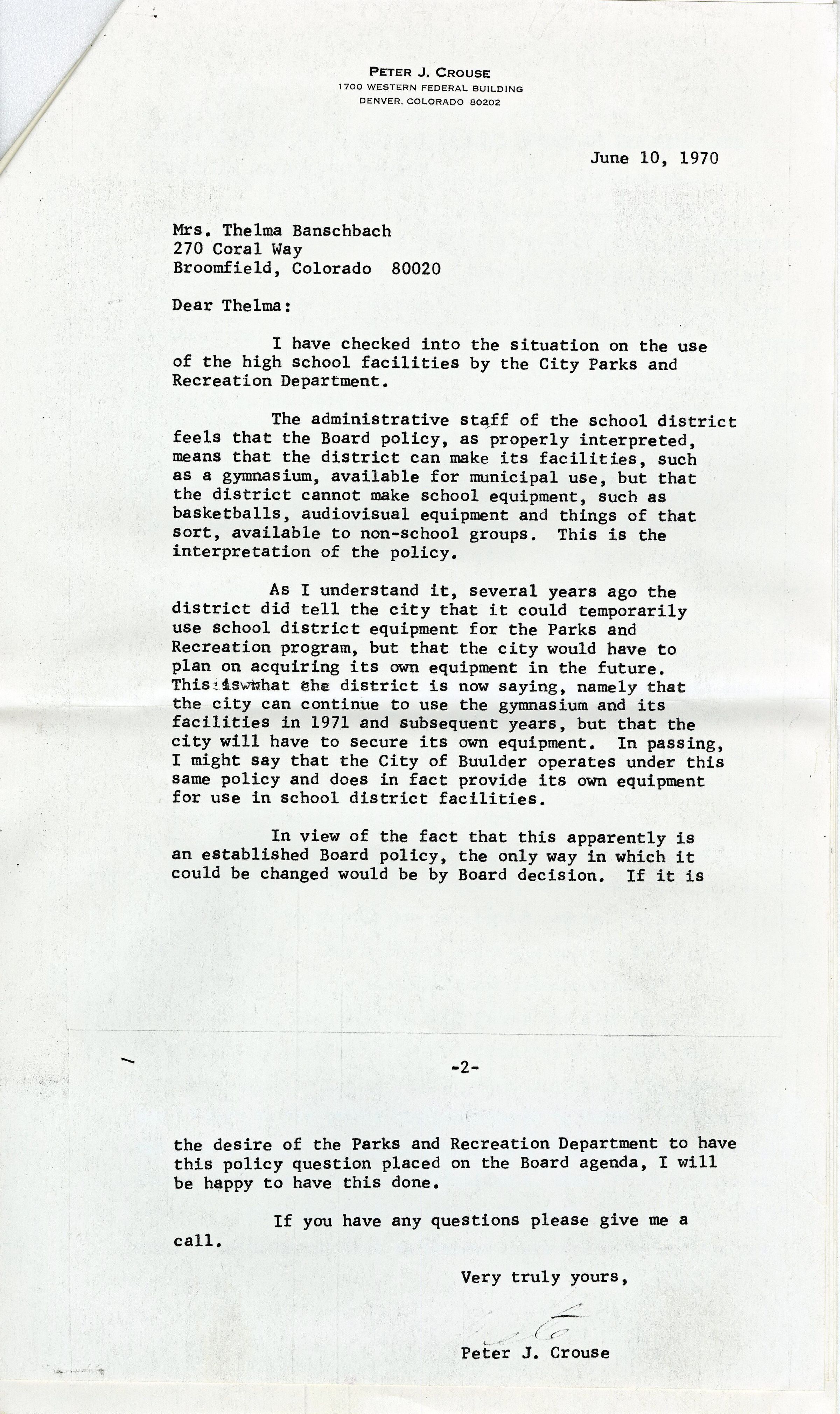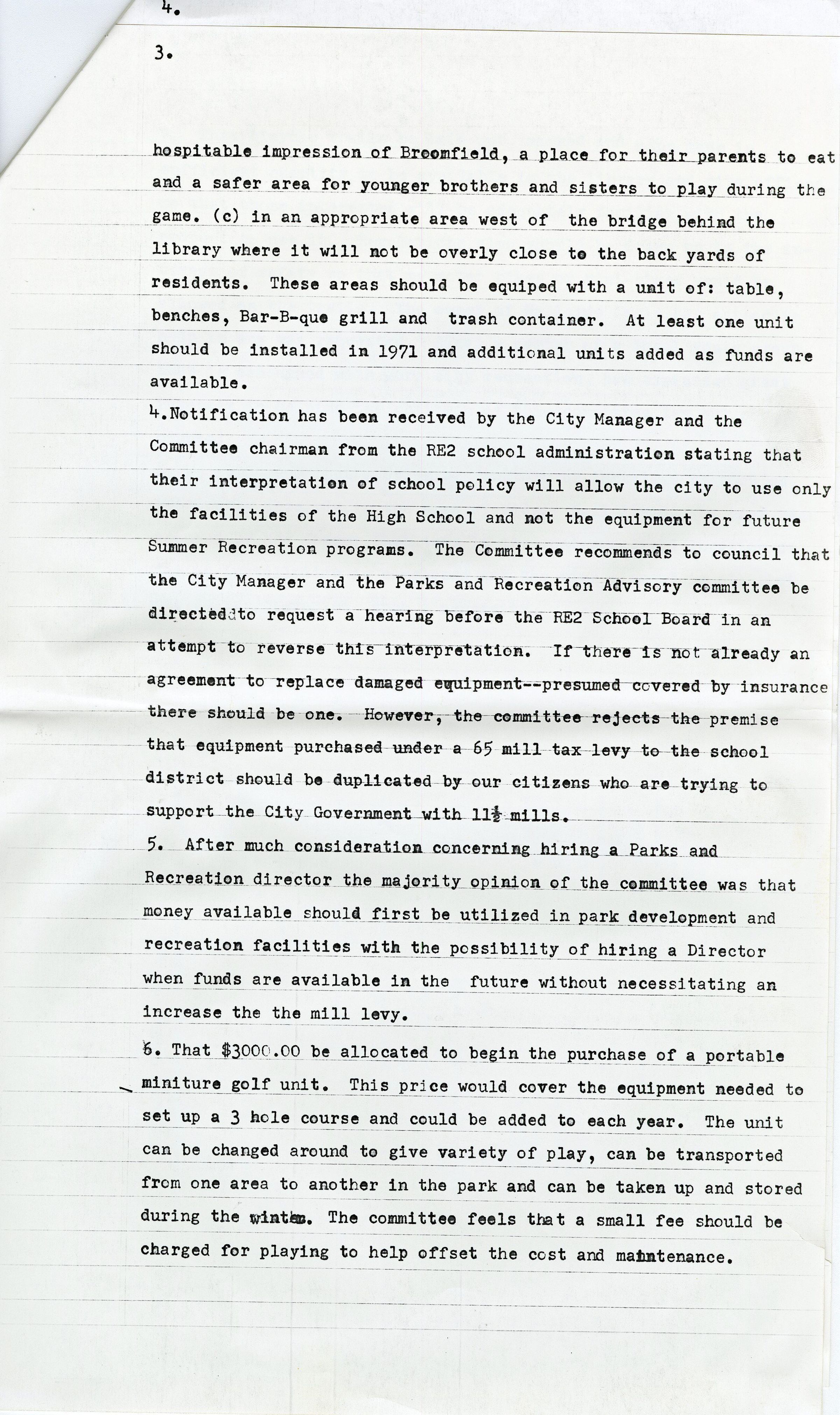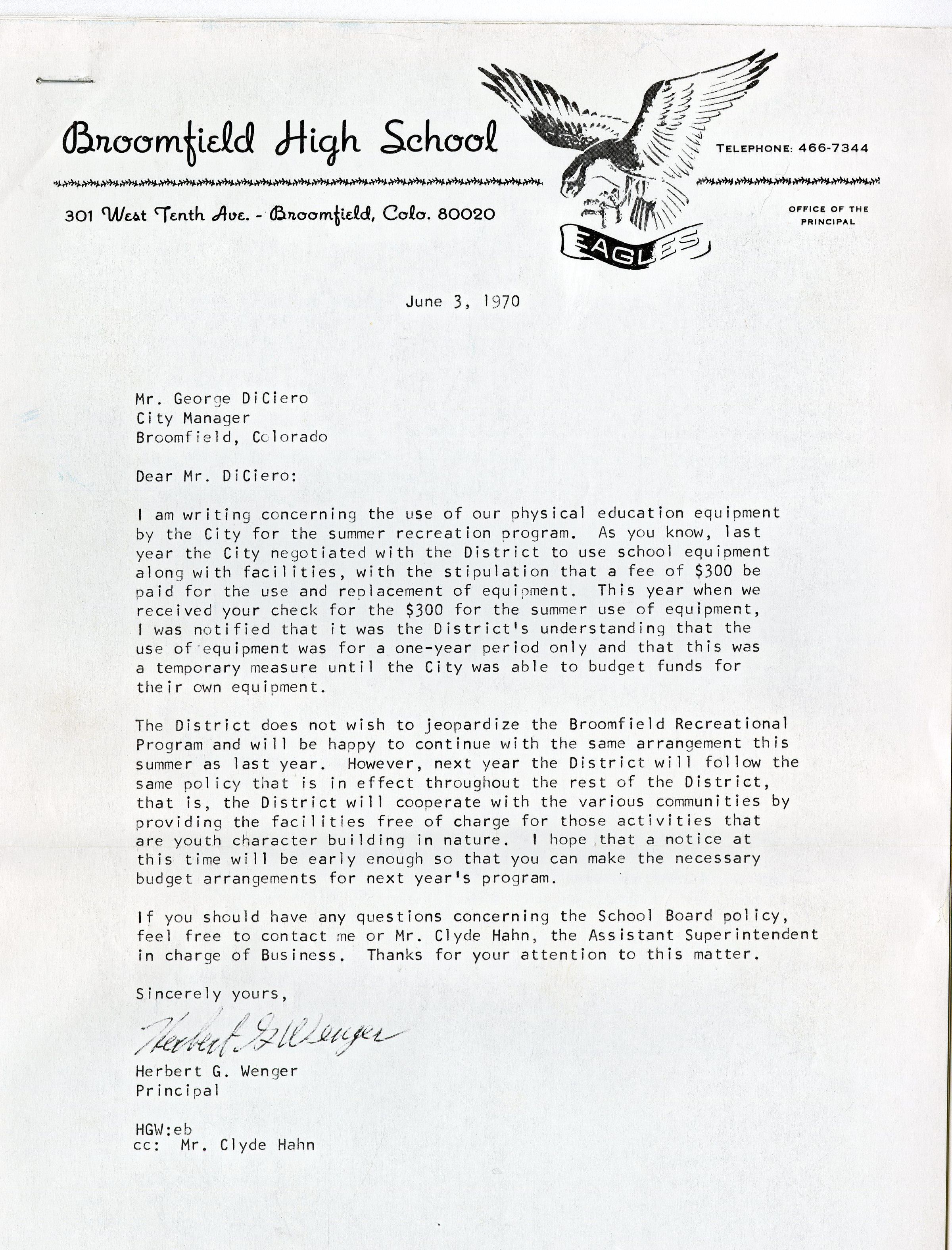 The first page is a letter by the Broomfield High School Principal Herbert G. Wenger to the City Manager George DiCiero about how long the City can use the school's physical education equipment for summer recreational programs based on the amount of money that was paid. The other letter are letters from the school district, Peter J. Crouse, to the Parks and Recreation Department, Mrs. Thelma Banschbach, about what equipment they can use and how the Rec Center should invest in their own equipment. The 4 full pages after are about how the Parks and Recreational Advisory Committee have written on how to promote more inclusion in their parks and recreational equipment with the budget they have.Collection