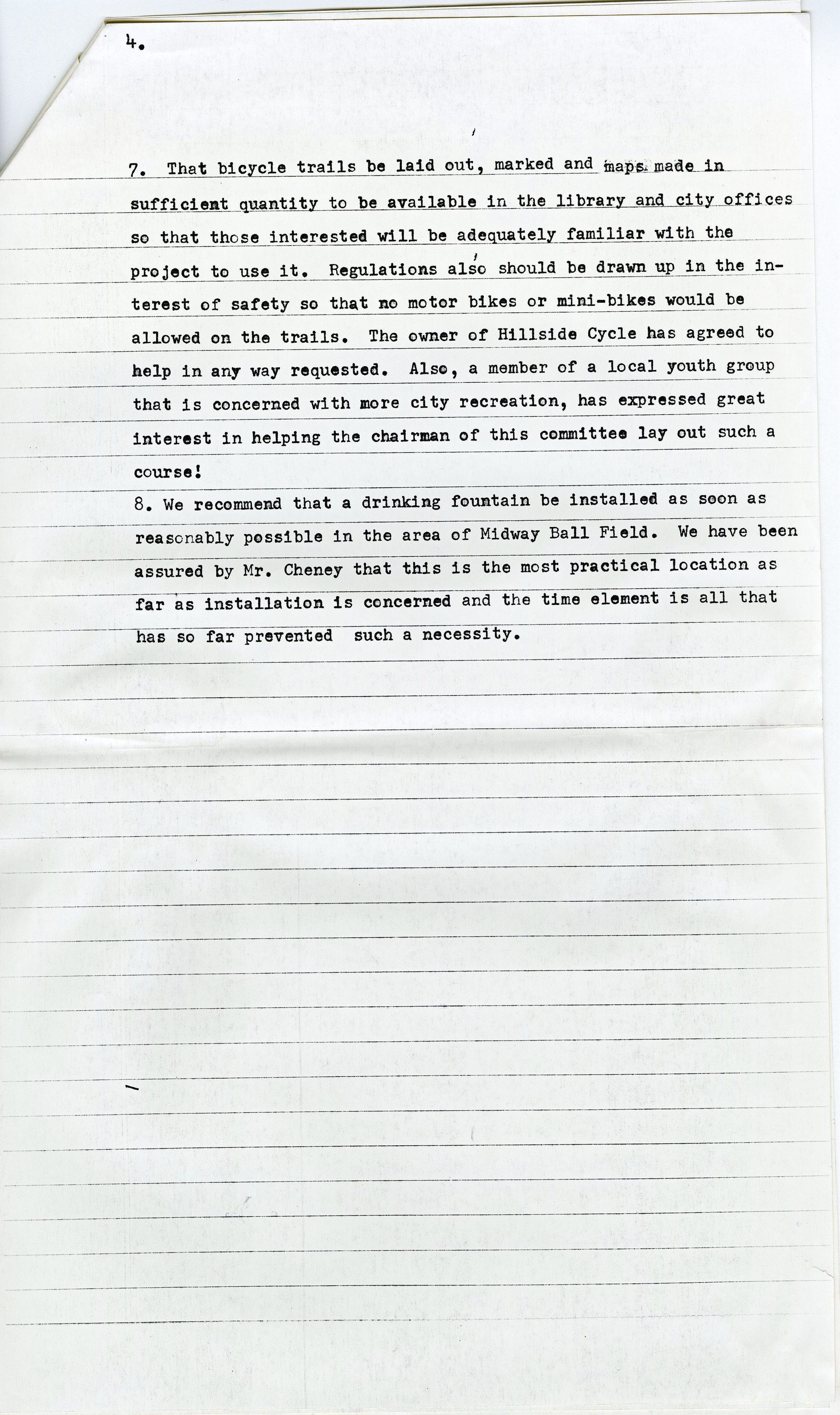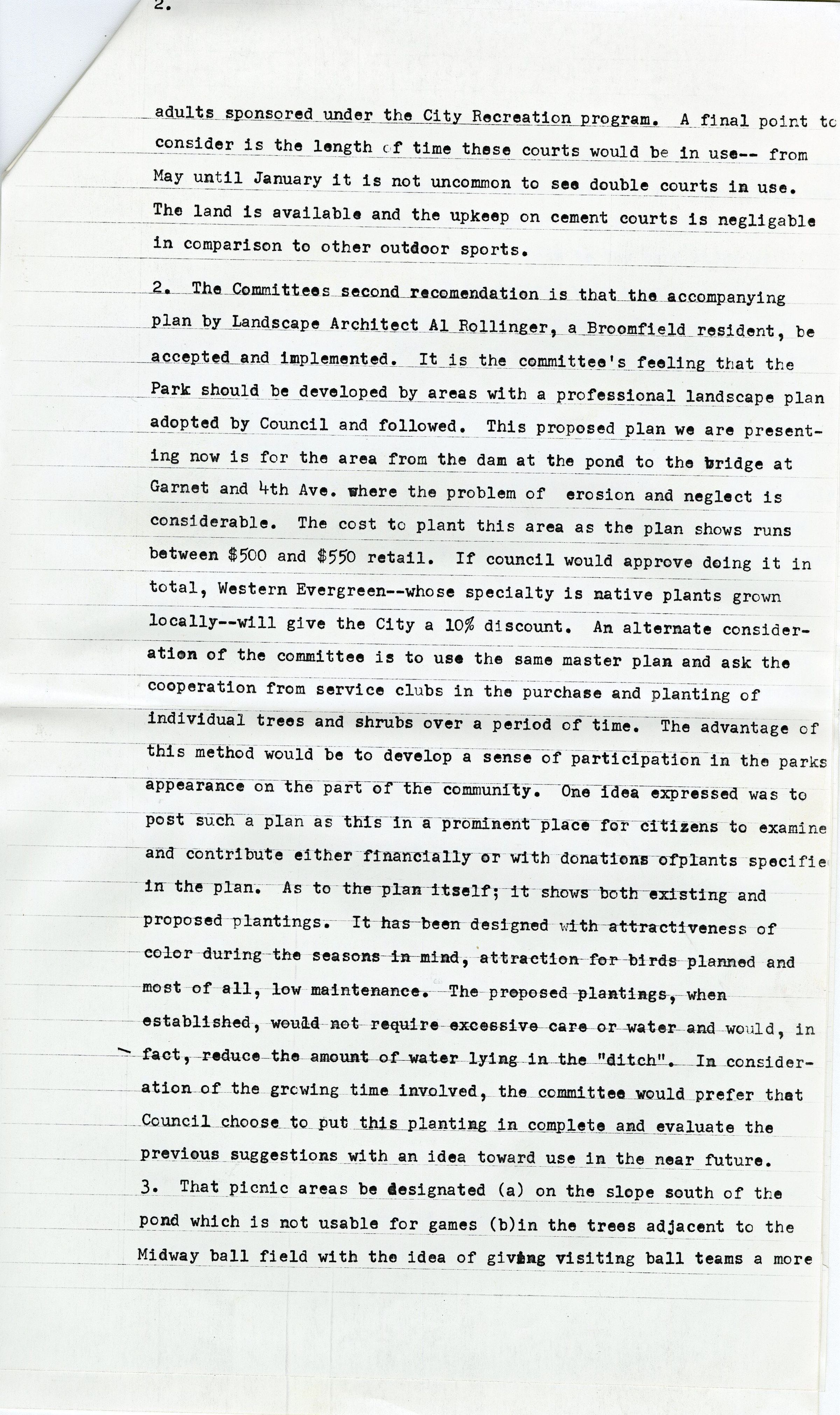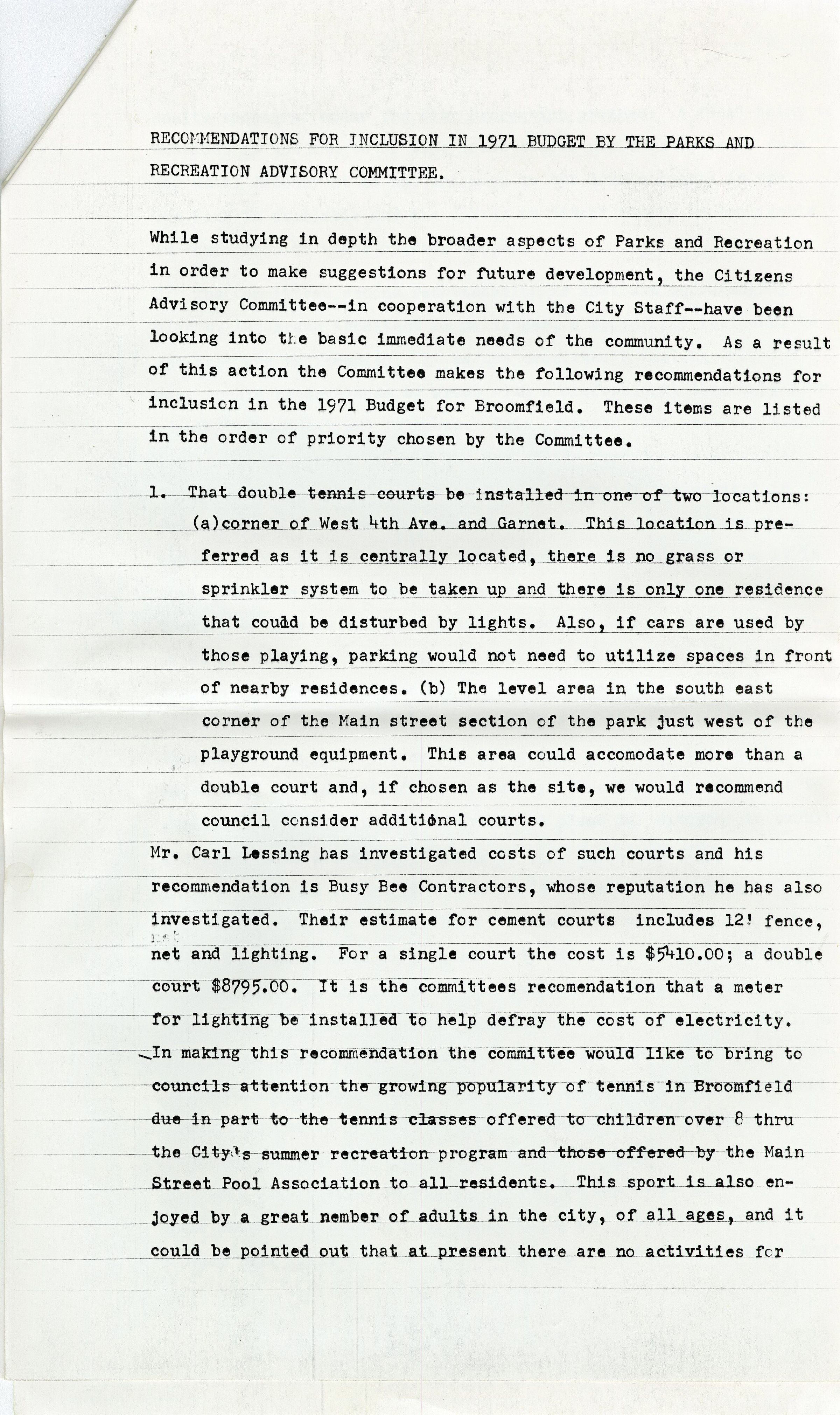 The first page is a letter by the Broomfield High School Principal Herbert G. Wenger to the City Manager George DiCiero about how long the City can use the school's physical education equipment for summer recreational programs based on the amount of money that was paid. The other letter are letters from the school district, Peter J. Crouse, to the Parks and Recreation Department, Mrs. Thelma Banschbach, about what equipment they can use and how the Rec Center should invest in their own equipment. The 4 full pages after are about how the Parks and Recreational Advisory Committee have written on how to promote more inclusion in their parks and recreational equipment with the budget they have.Collection