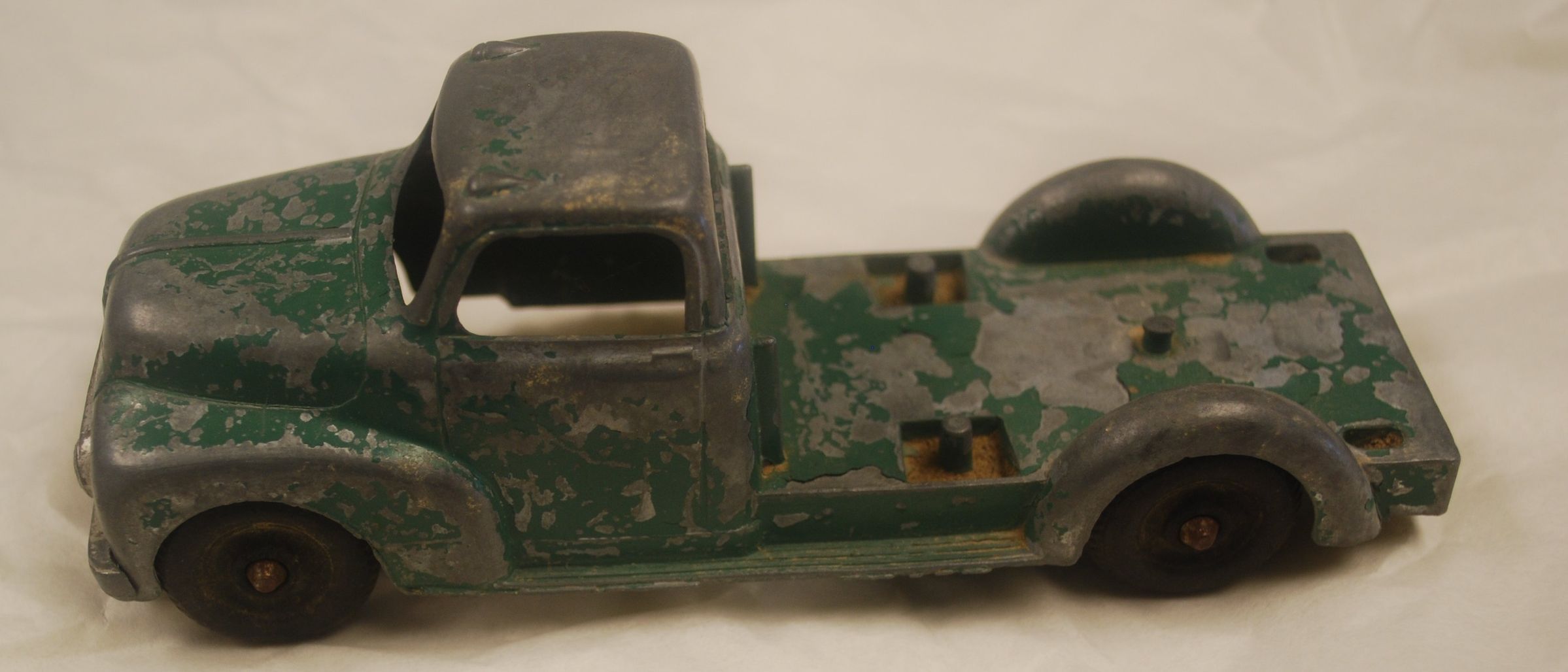 This is a green metal toy truck. The paint on the truck is peeling off. The truck has black wheels and holes where the windows would be in a real truck. The truck measures 2" (h) x 2" (w) x 6.5" (l).