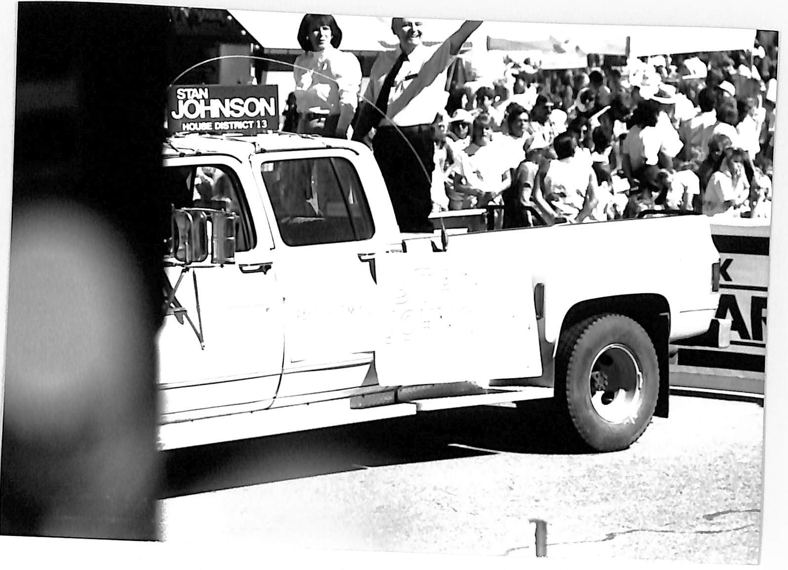 Item is a black-and-white photograph taken during the 1989 Broomfield Days event. In the photo, a parade is occurring, with crowds gathered on the side of the road to watch. Behind the crowds are tents hosting other festivities. Stan Johnson and Faye Fleming are standing in the back of a pickup truck with posters taped to the side and roof of the car. Fleming was running for District 13 State Representative, and Johnson was running for House District 13. They are waving to the crowd, since they're part of the parade. The left side of the photo is blocked by a dark blur.Photograph Details
