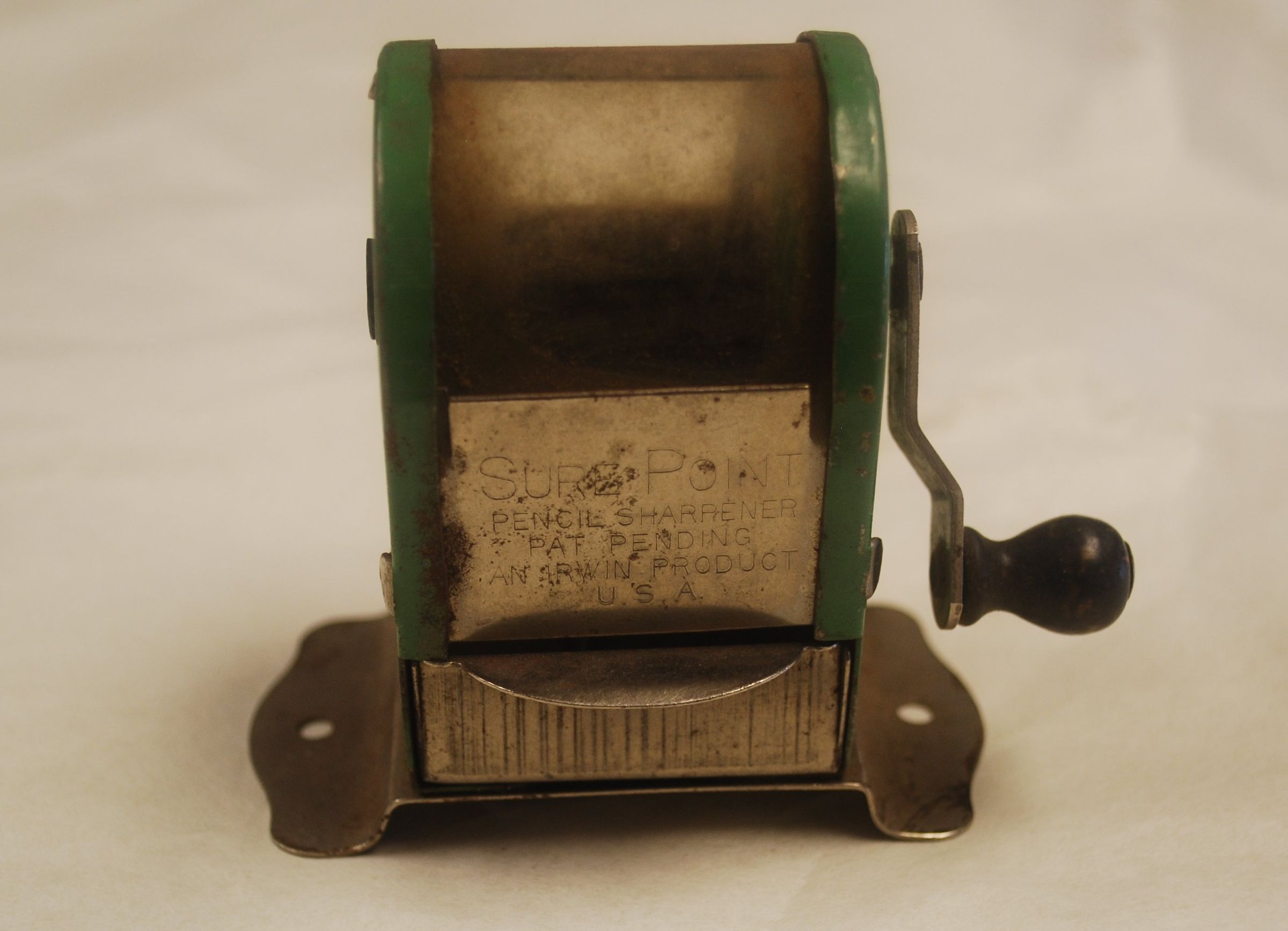 This is a Sure Point pencil sharpener. The pencil sharpener is metal with a wood knob on the handle. The sharpener is mainly silver in color with some green details. The pencil sharpener measures 3.5" (h) x 2" (w) x 3" (l).Collection