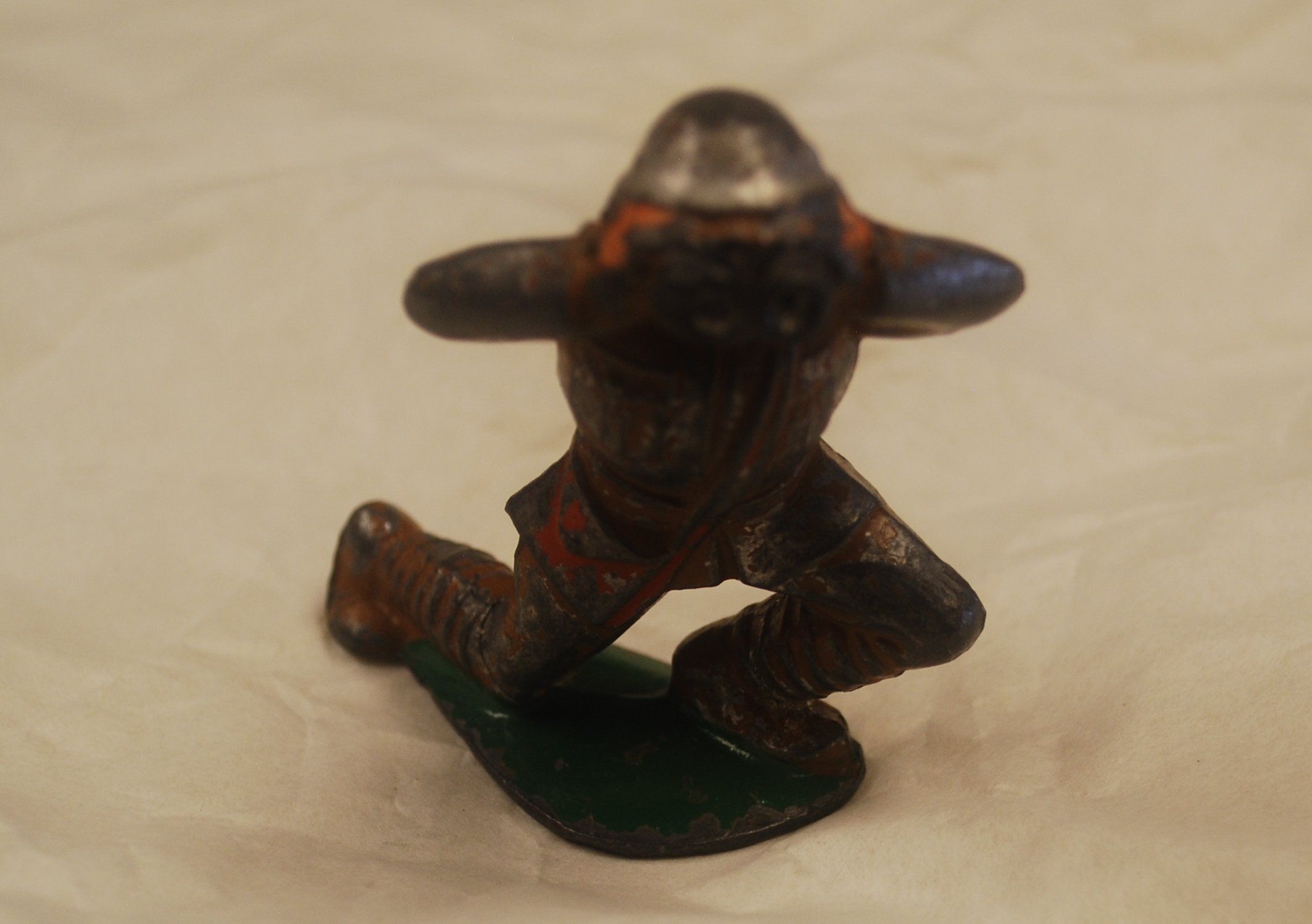 This is a metal toy soldier. The soldier is crouched over and looking through binoculars. The soldier is mostly silver with a little orange paint left. The base was painted green. The toy measures 2" (h) x 1" (w) x 2" (l).