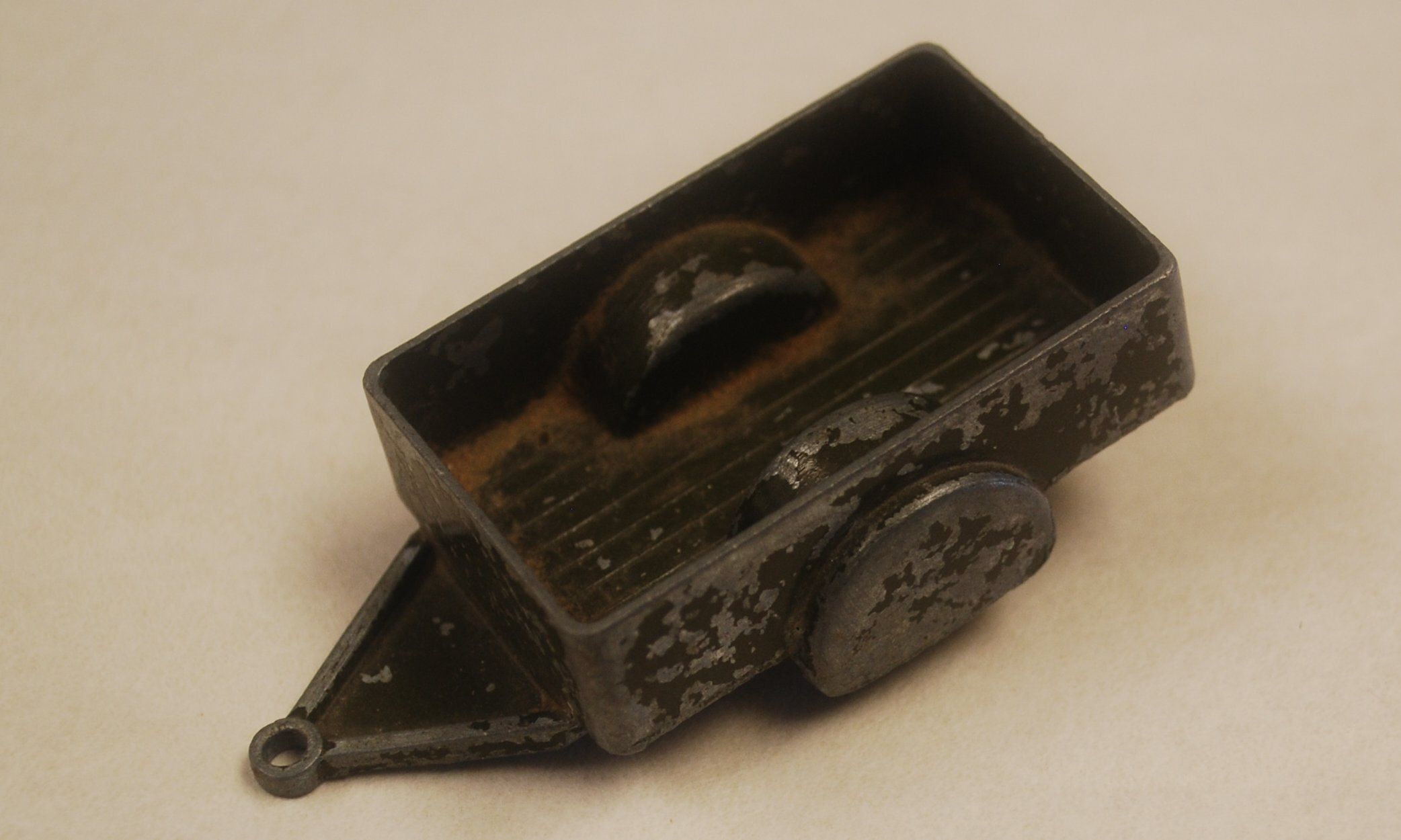 This is a miniature toy wagon or possibly a toy trailer to attach to a miniature truck. The wagon is painted a dark color, but the paint is peeling off. The silver color of the metal underneath can be seen. The wagon measures 0.5" (h) x 1.5" (w) x 2.5" (l).Lexicon