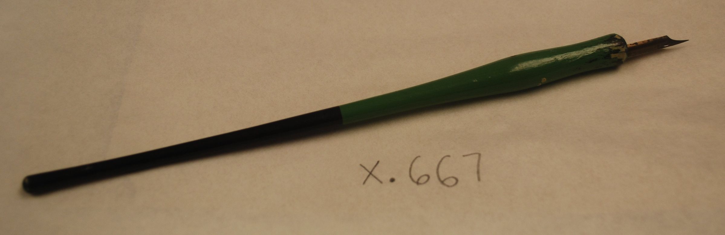 This is a pen with a wood nib. The pen is painted green and black. The pen measures 8" (l) x 0.5" (dia).