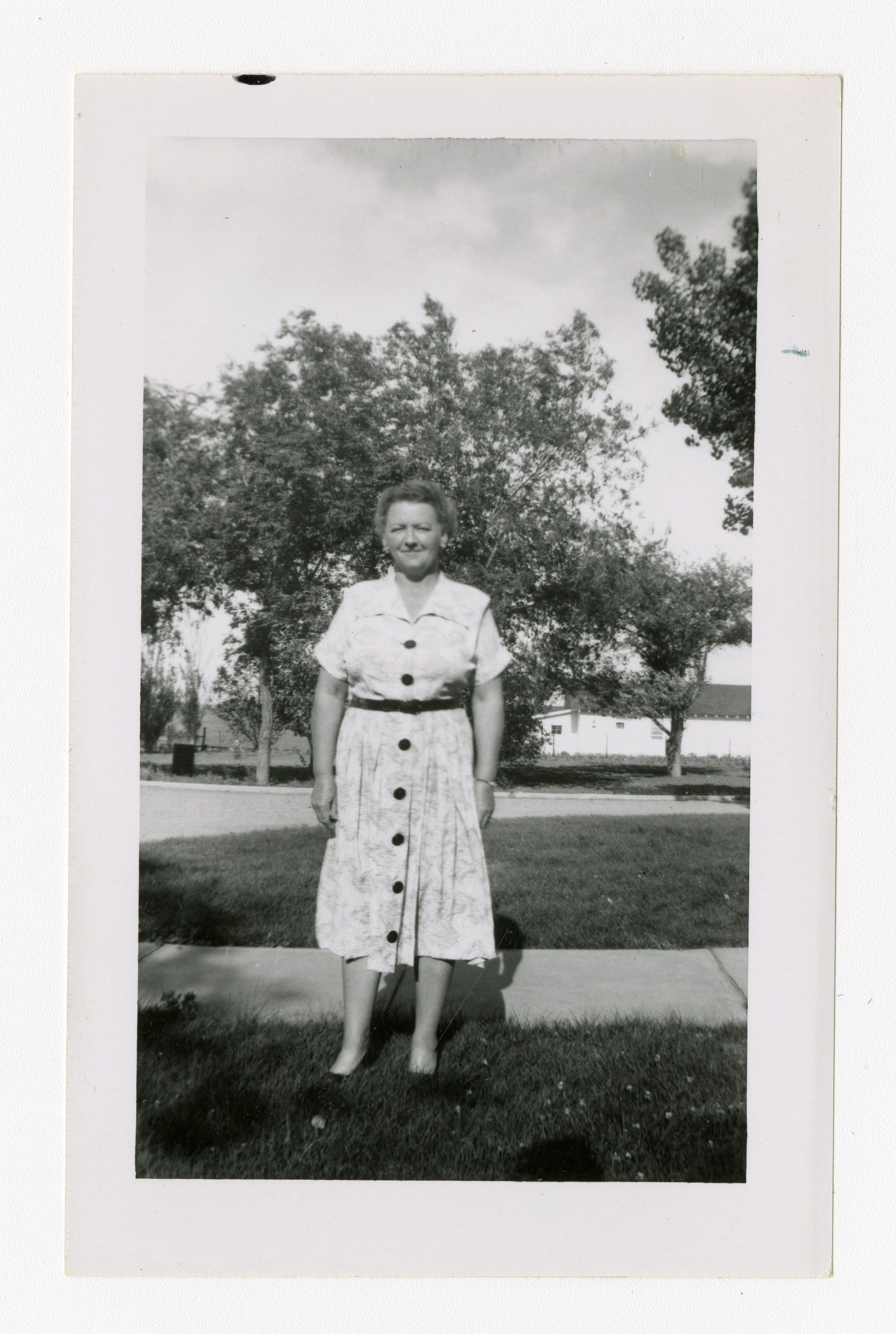 Black and White photograph of a woman. She is standing outside, on grass. There is a sidewalk behind her. In the background is a street and a house. She is wearing a light colored dress with a floral? pattern, and dark buttons. The woman is probably Lib Brunner.