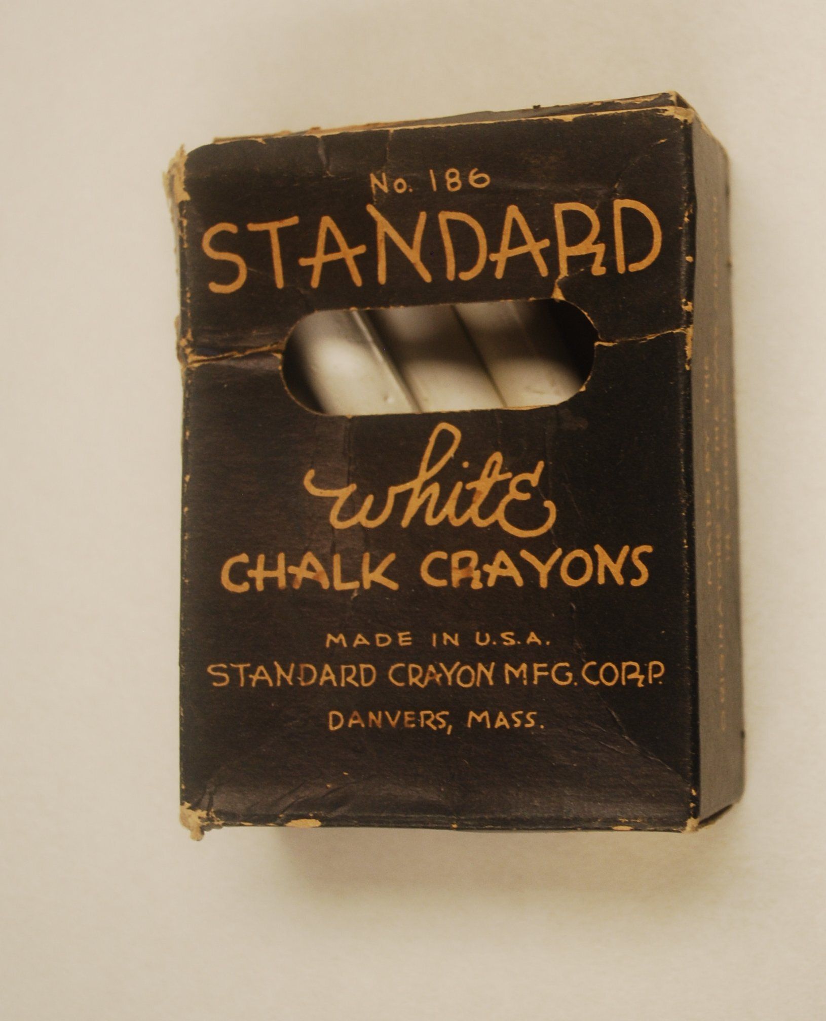 This is a box of chalk with four pieces of chalk inside. The box is black and made of cardboard. The text on the front of the box reads, "Standard/ White/ Chalk Crayons/ Made in U.S.A./ Chalk Crayons Mfg. Corp./ Danvers, Mass.". The box measures 3" (h) x 1" (w) x 2.5" (l).