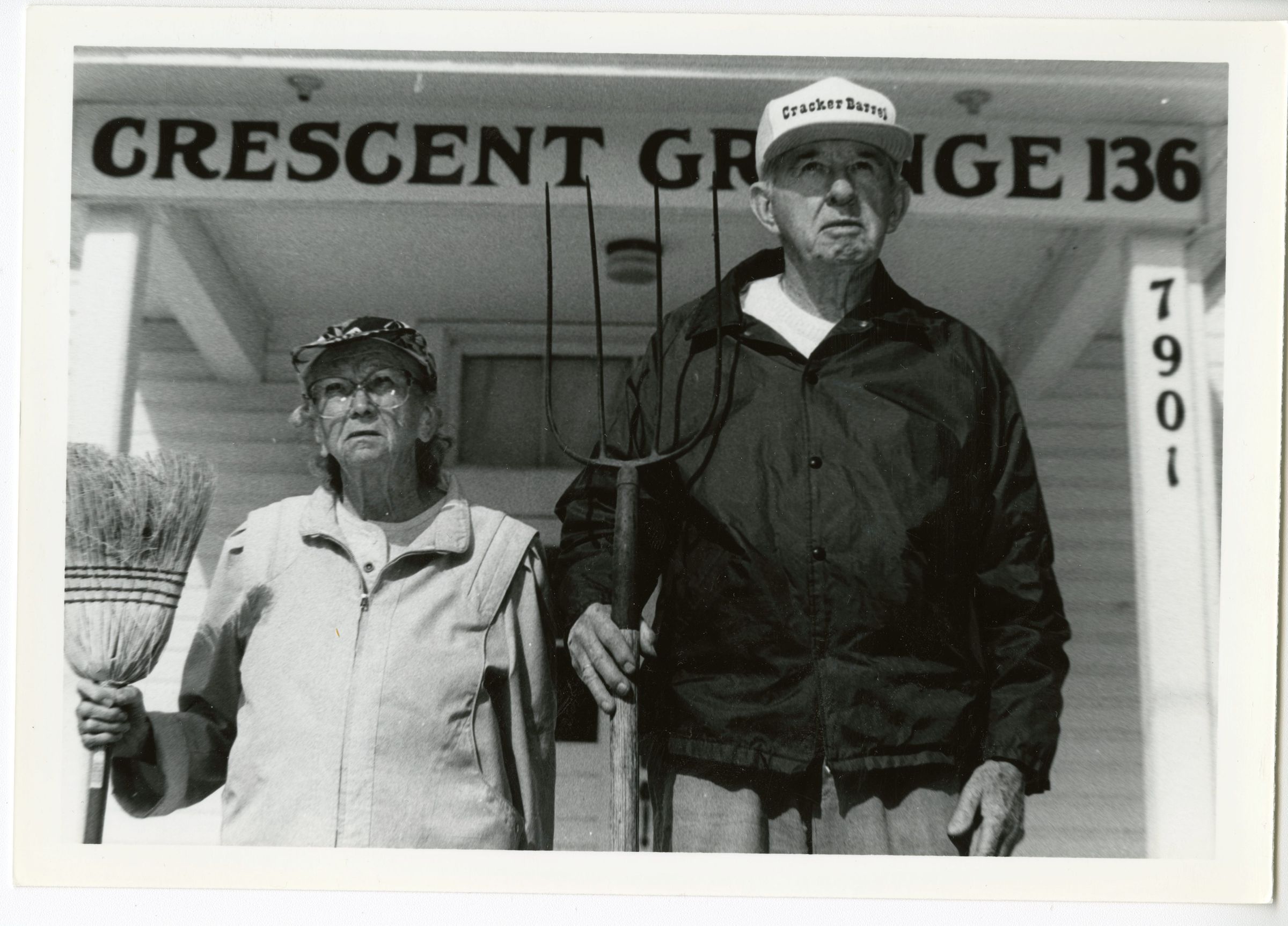 Black and white photo of the unknown couple in front of the Crescent Grange posing like Grant Wood's famous painting "American Gothic" circa 1993.