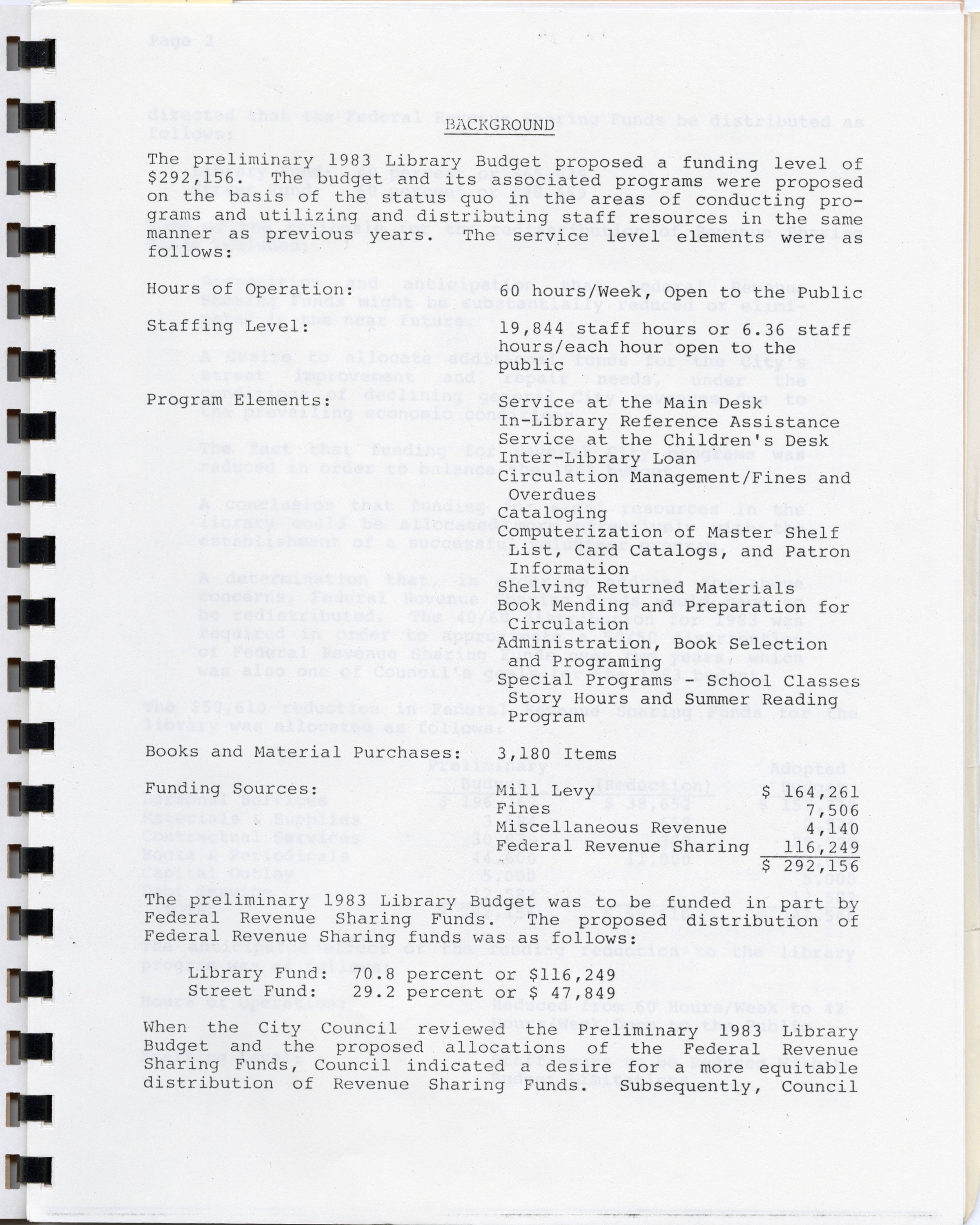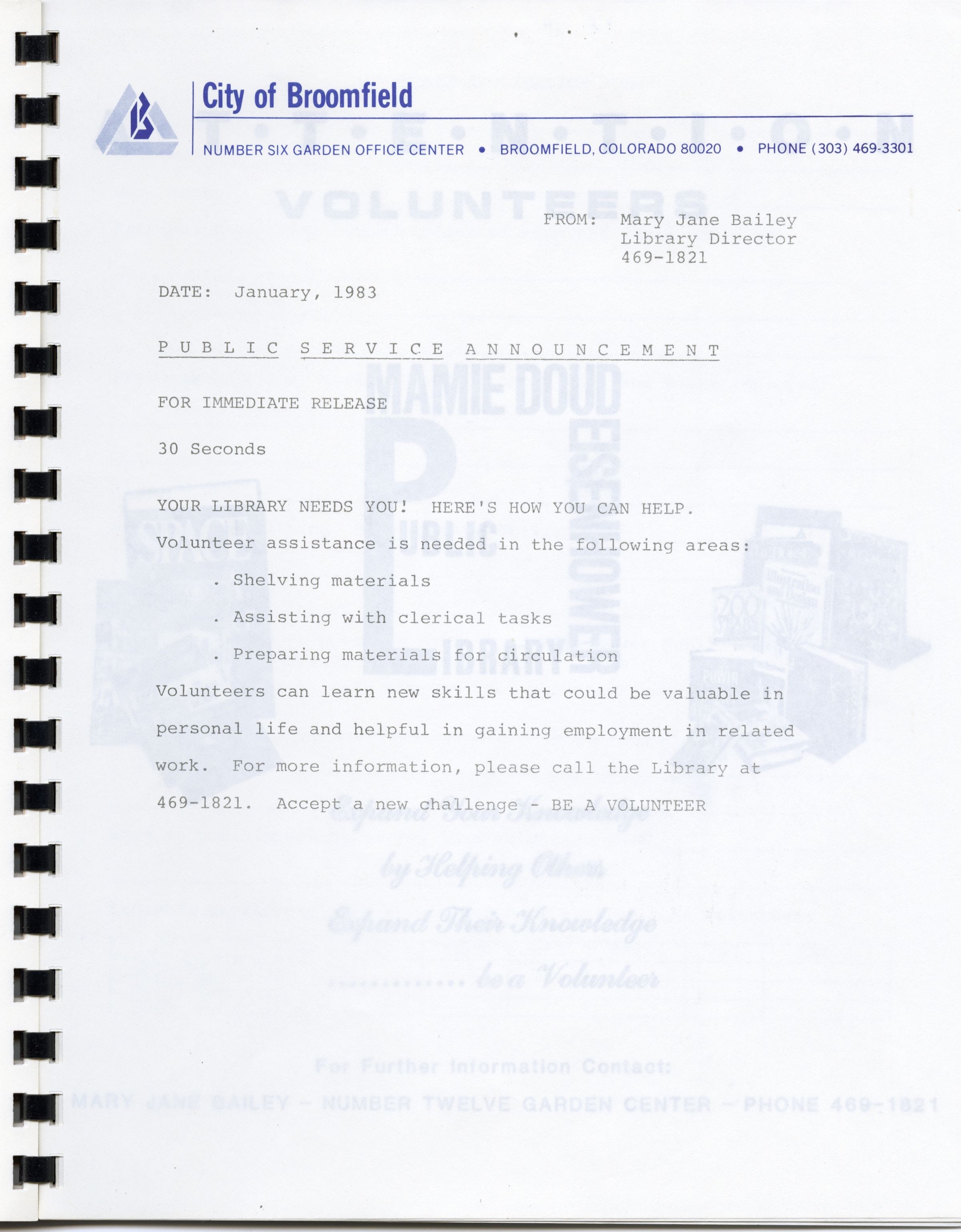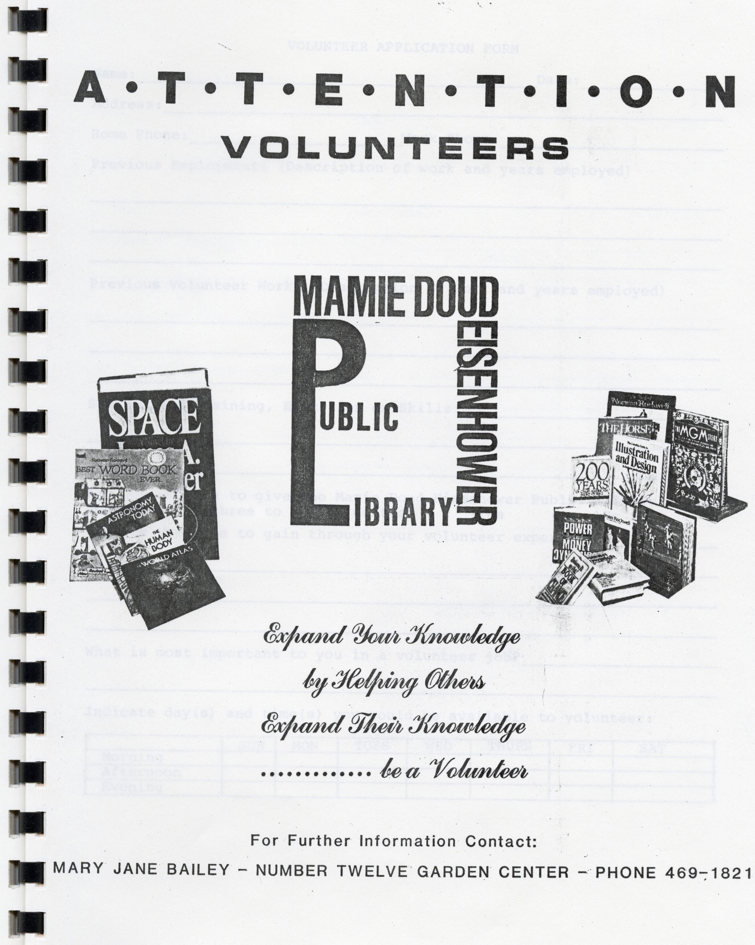The annual report for the Mamie Doud Eisenhower Public Library for 1983. It includes information on the background of the program, a staff review, as well as a summary and analysis of the 1983 program plan. Also included is a manning schedule analysis, library volunteer program, school district public library service, and the Adams County Intergovernmental Agreement.