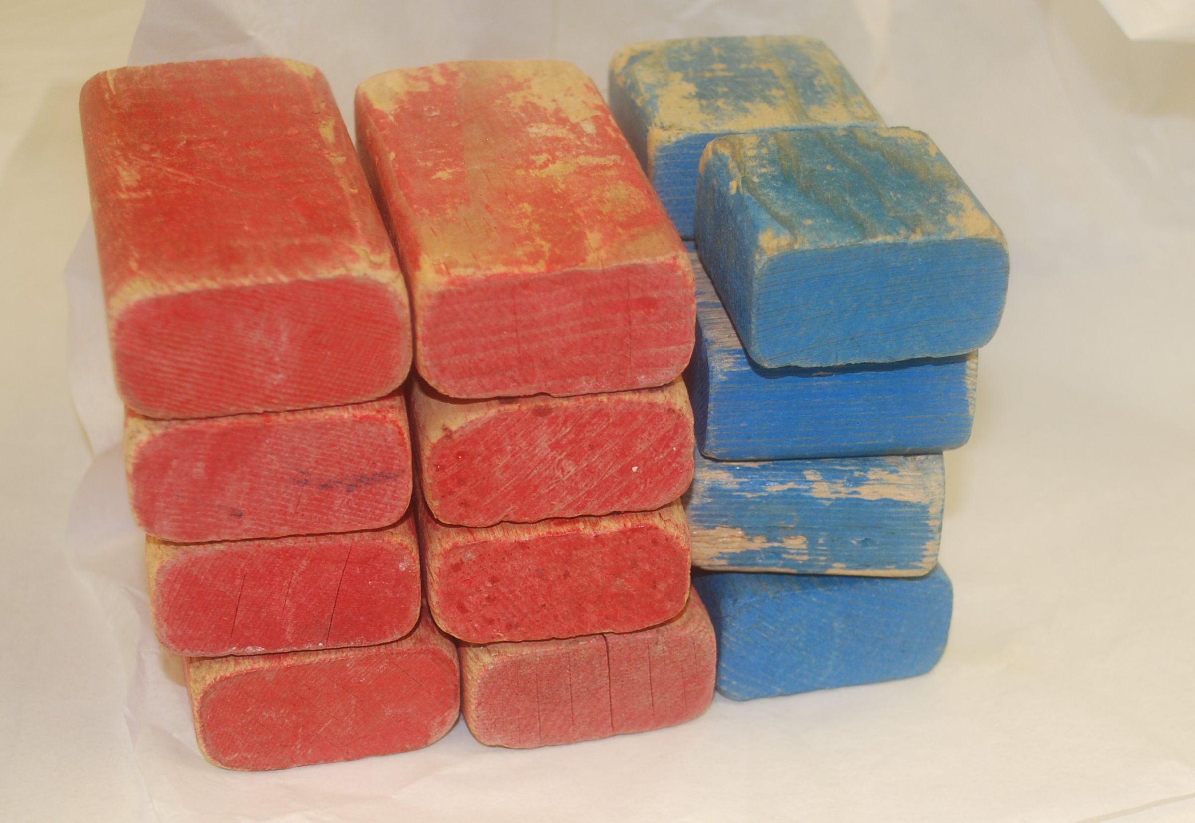 This is a set of 16 wooden toy building blocks. There are 8 red rectangular blocks that measure 0.75" (h) x 1.5" (w) x 3.5" (l). There are 8 rectangular blue blocks that measure 1.5" (h) x 1.75" (w) x 3.25" (l).