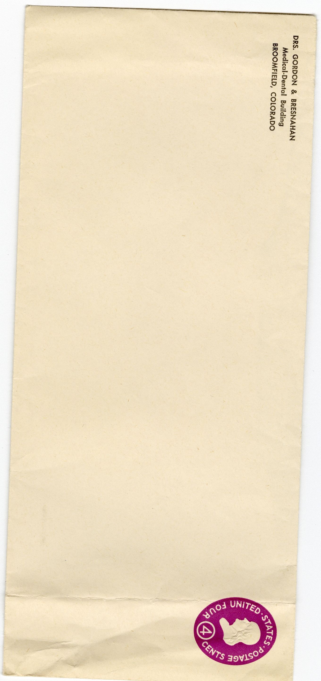 (b) Item is the envelope that this note came in. There is no evidence that it has ever been sealed. The top left of the back of the envelope hosts a printed label: "Drs. Gordon & Bresnahan, Medical-Dental Building, Broomfield, Colorado." A purple oval labeled "United States Postage, 4 Cents" with a white image of Benjamin Franklin's head can be seen in the top right.Collection