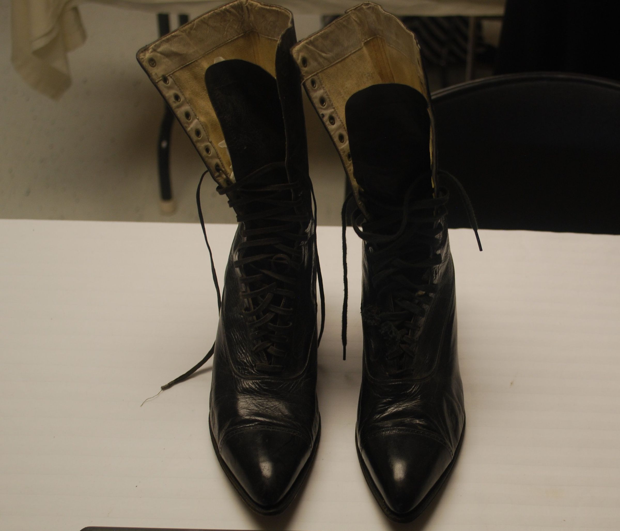 This is a pair of women's black high top shoes. The shoes are made of black leather and have black laces. Each shoe measures 10" (h) x 3.25" (w) x 10.5" (l).