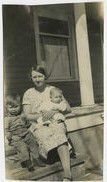 Black and white photograph of a woman and two children sitting on porch steps. The older child is sitting on the left of the image. The woman is wearing a dress and stockings. She is holding a baby. The older child is probably Clyde Brunner. The woman is probably Lib Brunner, while the baby is probably Gib Brunner.