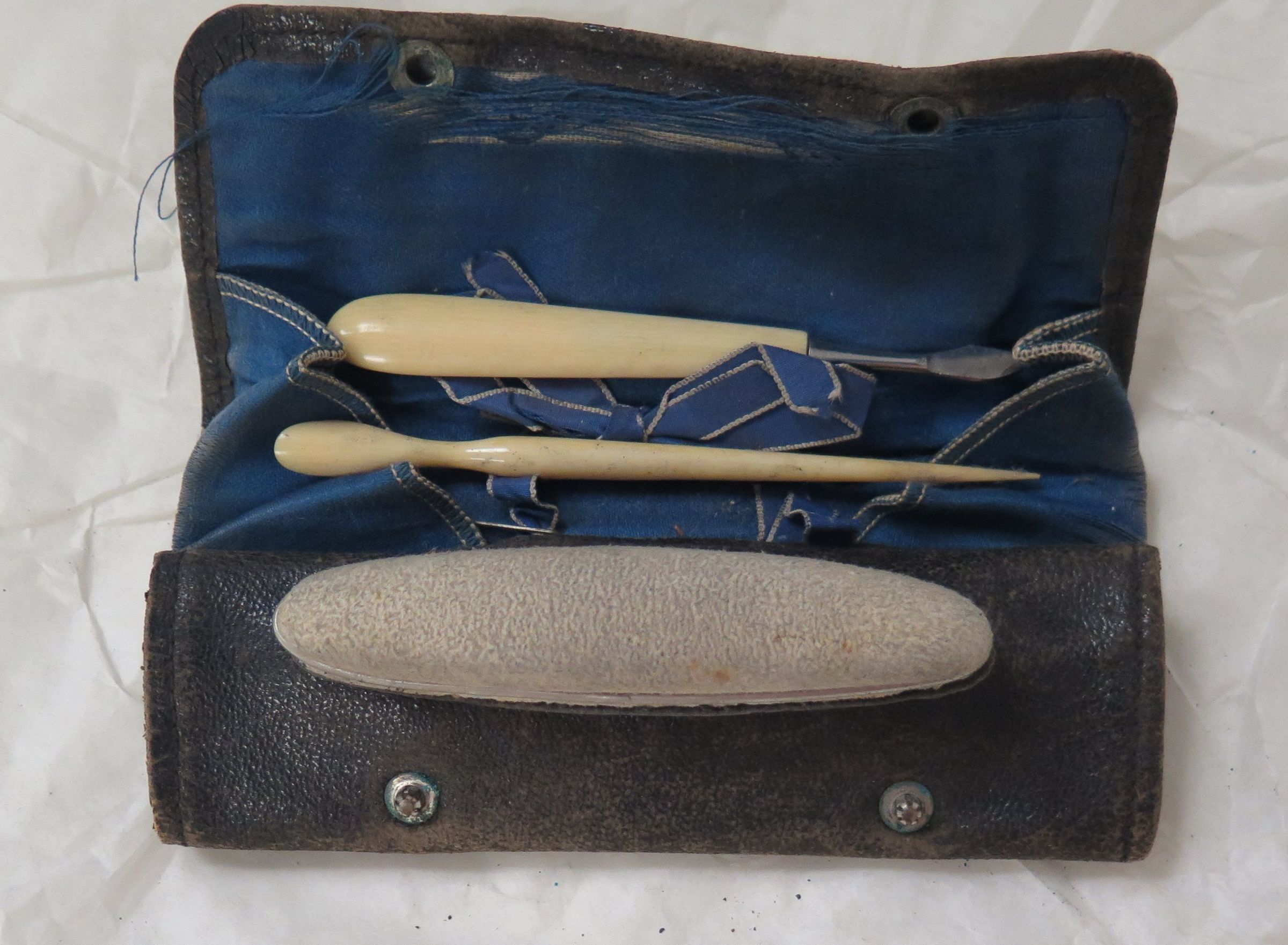 This is a black leather pouch housing a manicure set. The pouch is lined with blue fabric and has two buttons to keep the top flap closed. The kit has three tools inside. The manicure set measures 3" (w) x 5.5" (l).