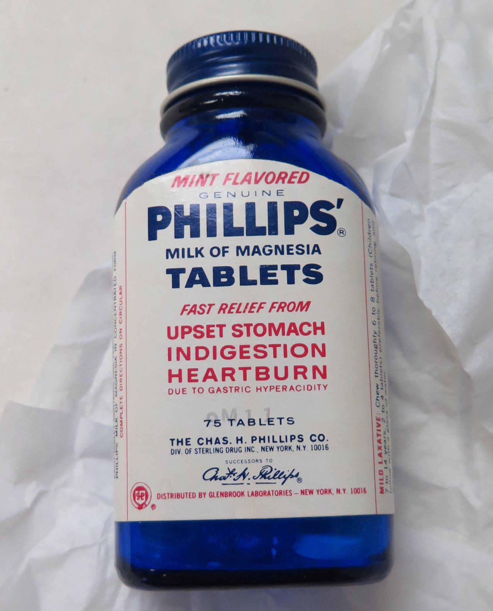 This is a blue glass bottle of Phillips Milk of Magnesia tablets with a black metal lid. There were originally 75 tablets in the bottle. The bottle measures 4" (h) x 1.5" (w).