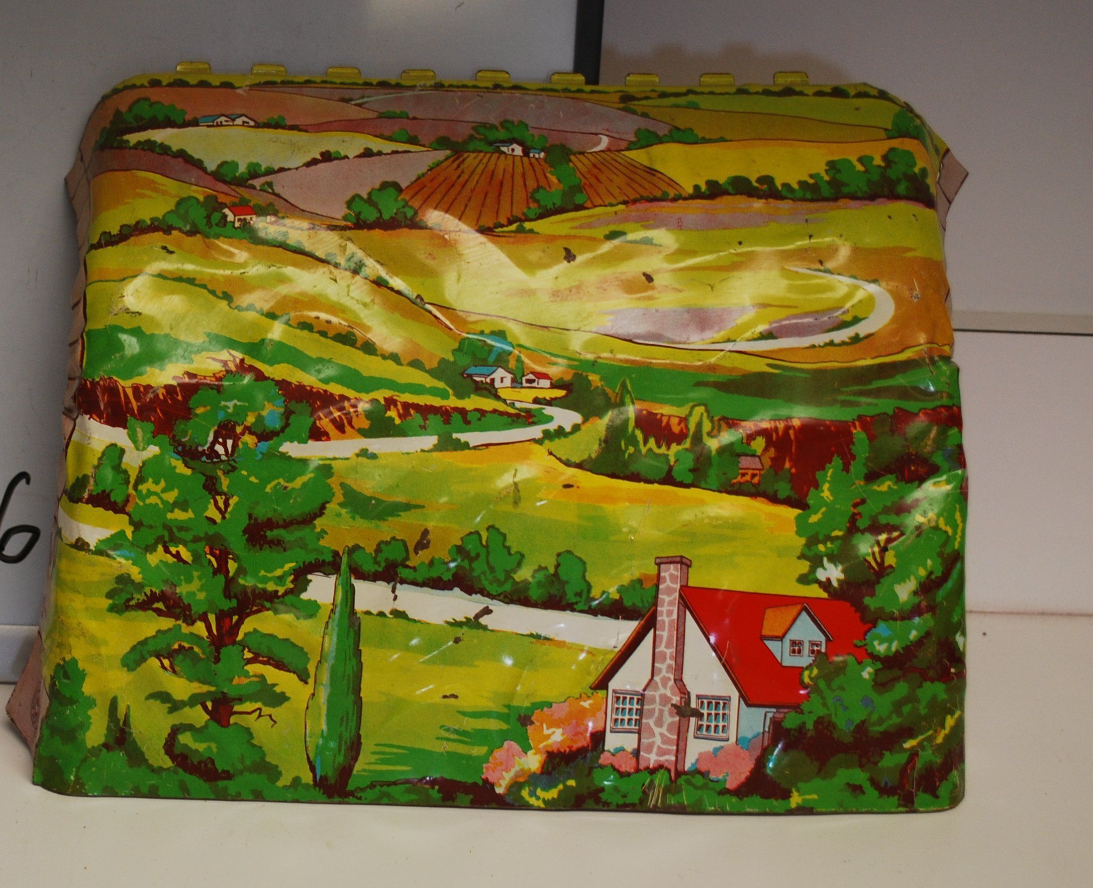 This is a tin lid with trees and houses painted on it. It is not clear what it was the lid for originally. The lid measures 10.5" (h) x 9" (w) x 2" (d) .