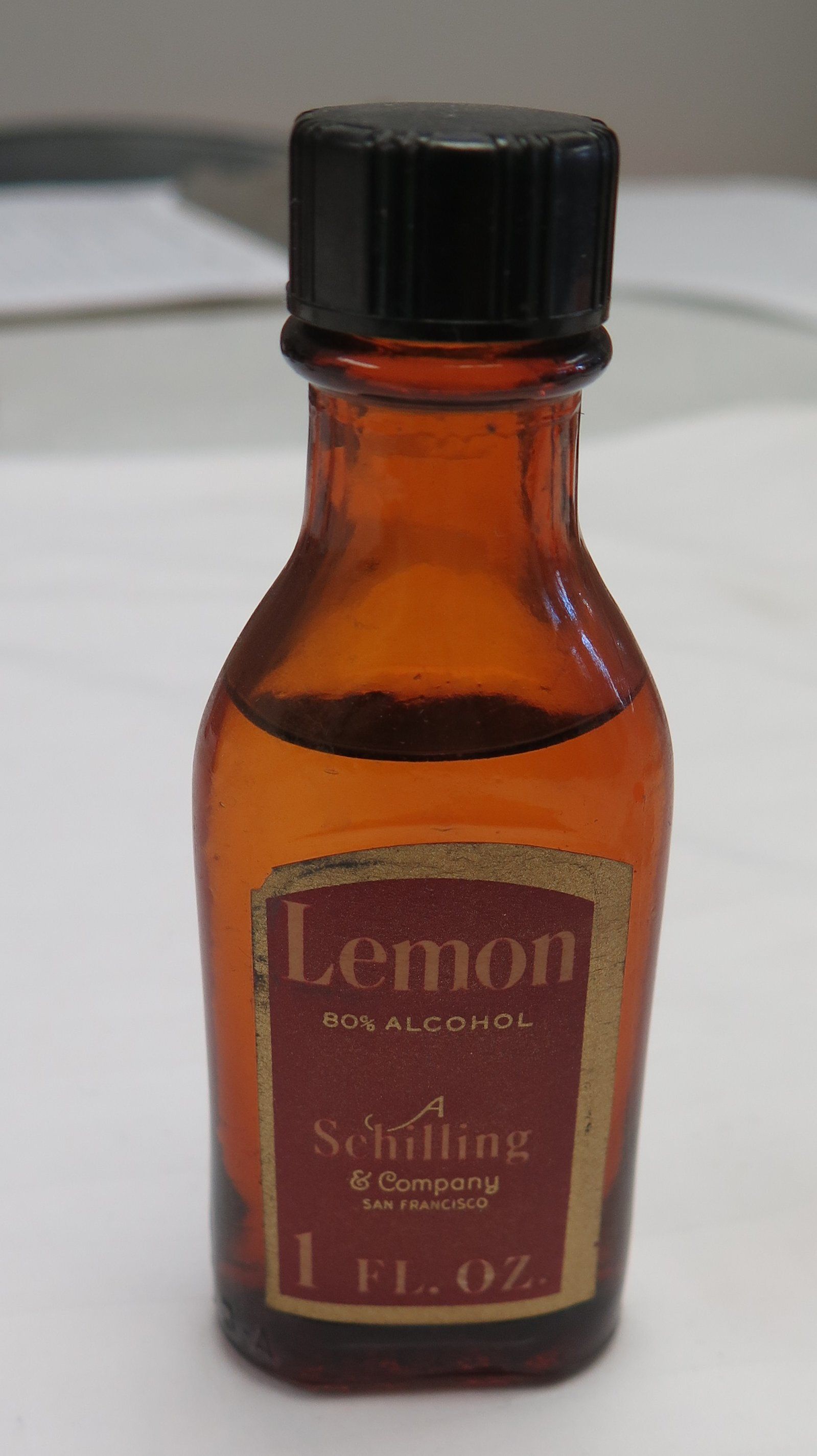 This is a bottle of Lemon made by Schilling. The bottle is brown with a black plastic lid. The bottle contains 1 fl. oz. The bottle measures 4" (h).