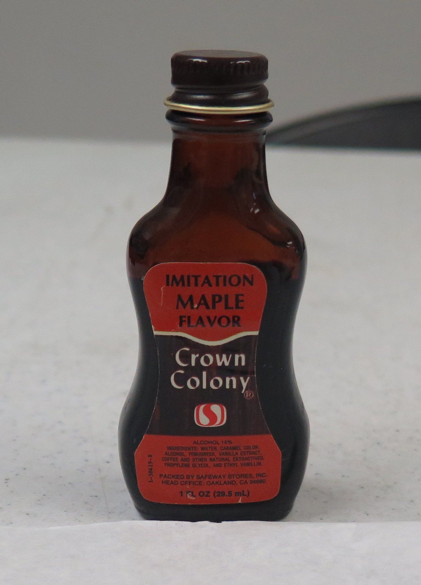 This is a bottle of imitation maple flavoring made by Crown Colony. The bottle is brown glass with a black metal lid. The bottle measures 3.5" (h).