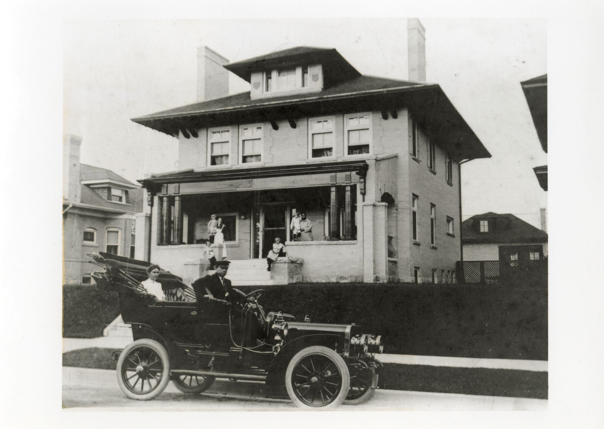 Item is a black-and-white photograph of the John and Elivera Doud House, the building where Mamie Doud Eisenhower lived as an adolescent. Her family, including parents John and Elivera, moved into the house when she was nine years old, and she married Dwight Eisenhower, former president of the United States, in the living room. This photograph centers on the house, with some of the neighboring properties visible nearby. A convertible car is parked outside the building with its roof down, and children, likely members of the Doud Family, can be seen on the porch. The photo is laminated and has a white border. The address of the house is 750 Lafayette St., Denver, Colorado.Photograph Details
