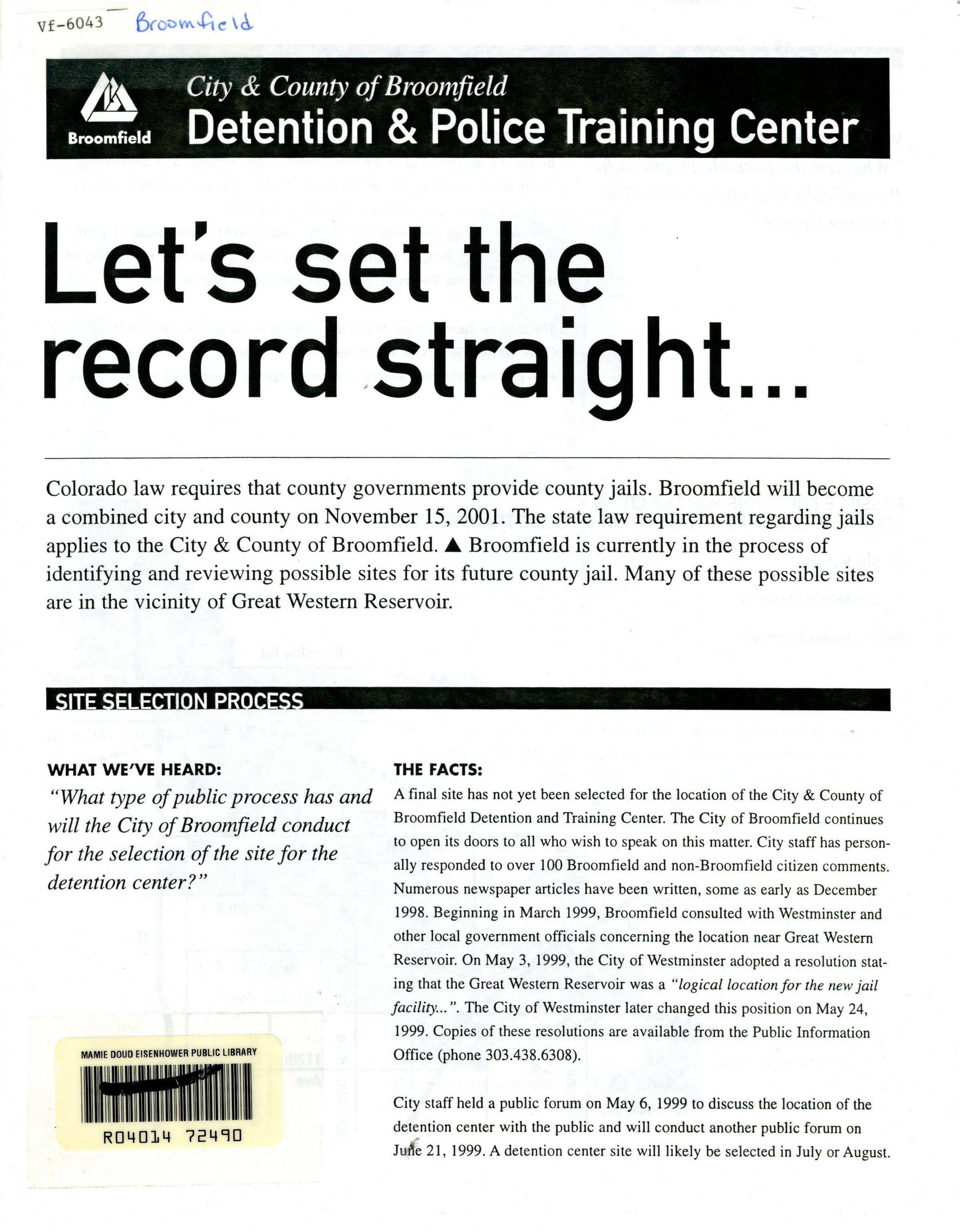 Pamphlet published by the City and County of Broomfield about a site for the future county jail. It lists the myths that people have heard and explains the actual situation.
