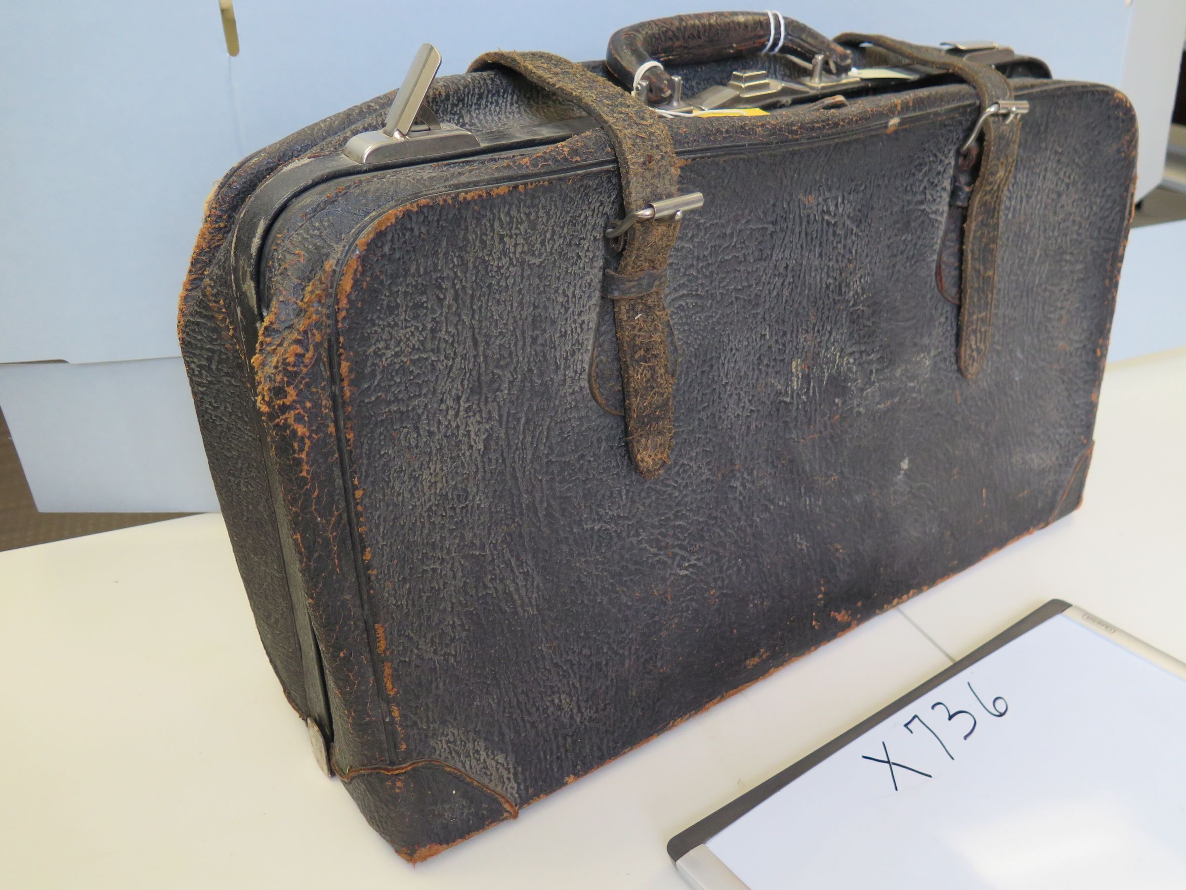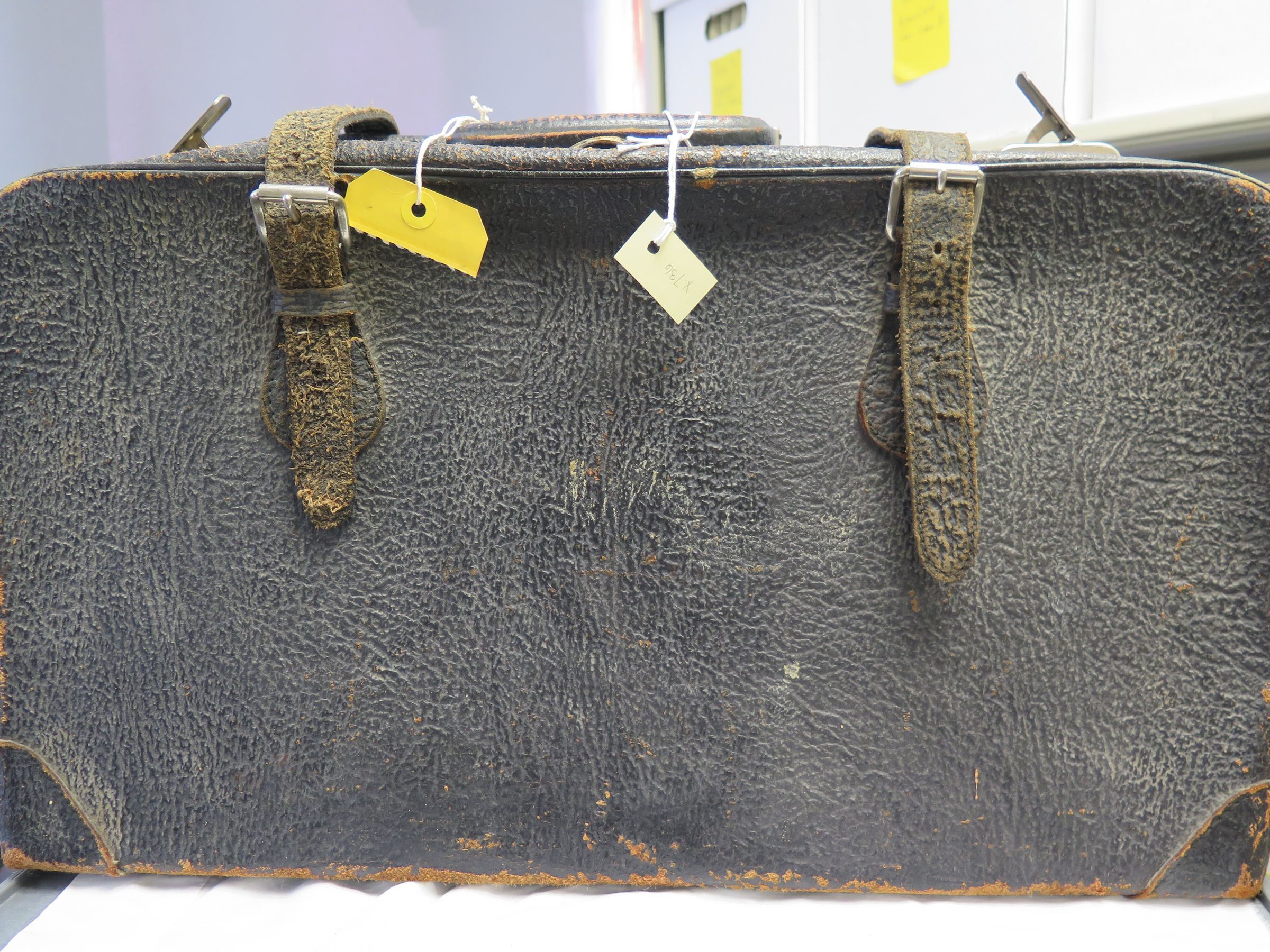 This is a black leather suitcase with a metal clasp, a brown leather handle, and 2 brown leather straps on the top. The straps are holding the suitcase closed and being held by the buckles on the suitcase. The clasp at the top is not latched. The suitcase is worn, and the color of the leather has started to fade. The suitcase measures 14.5" (h) x 25" (w) x 8" (d).