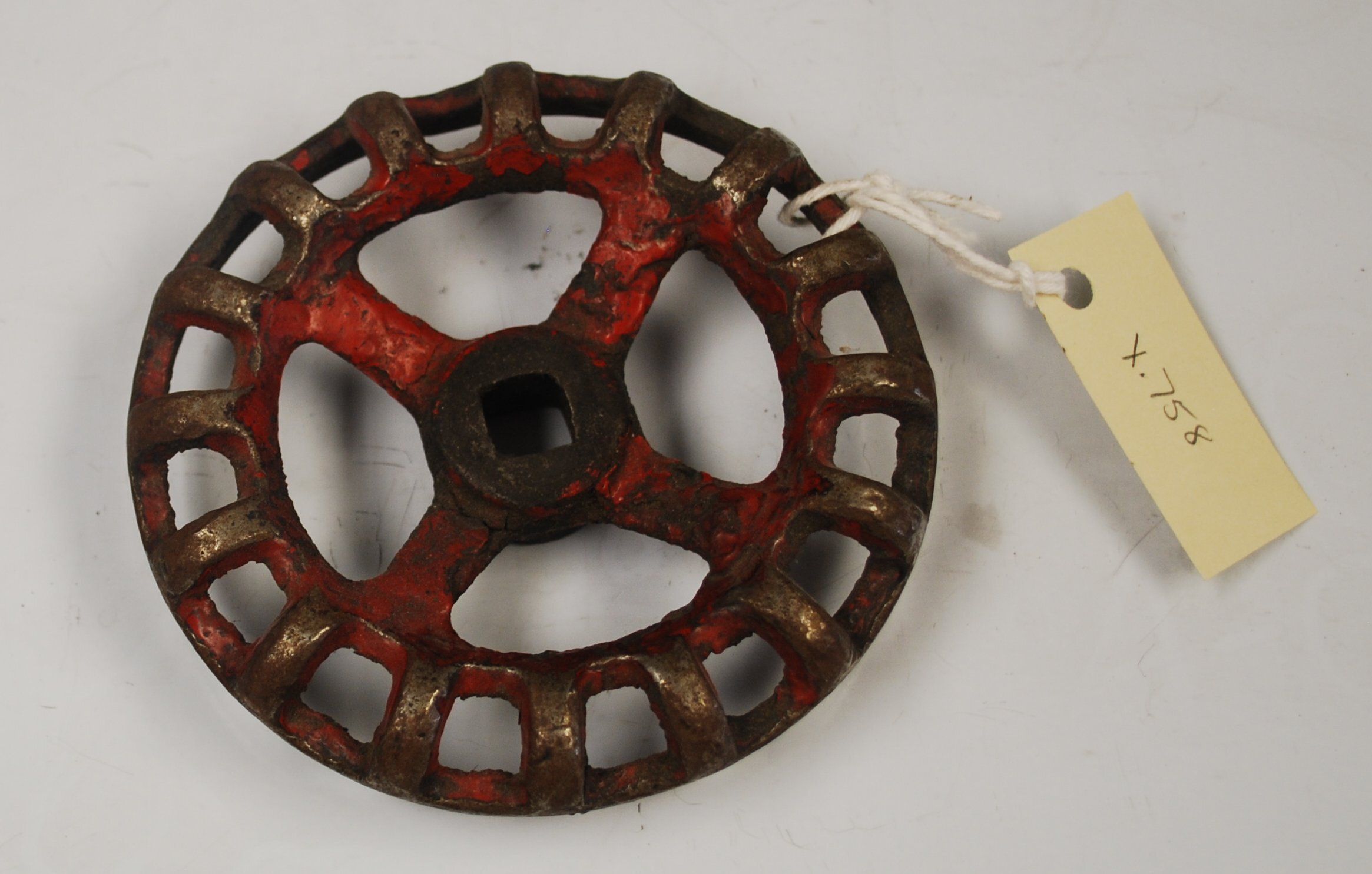 This is a metal control knob from a train. The knob is metal and painted red. The control knob measures 1" (h) x 4.5" (w).