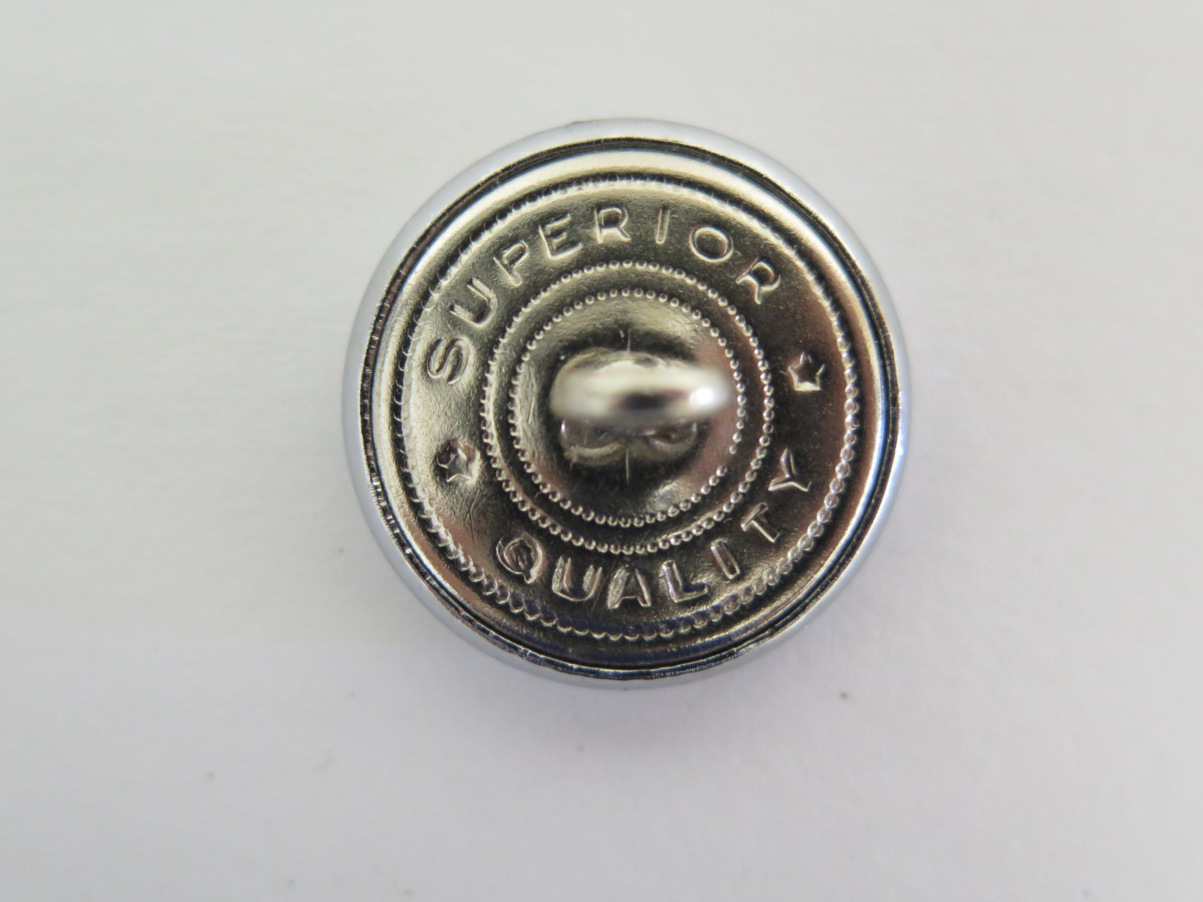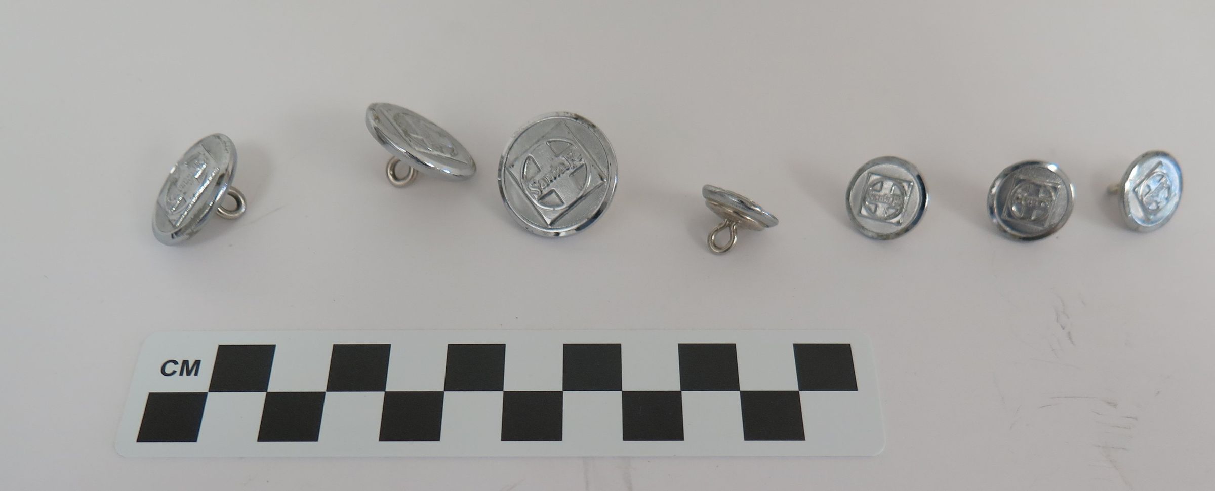 This is a set of 7 buttons. There are 4 buttons of a larger size and 3 of a smaller size. The buttons are metal with the Santa Fe RailRoad logo on them. The back of each button has text that reads, "Superior Quality" around the edges. The center of each button back has the loop to attach it to a garment. Each large button measures 1" (dia). Each small button measures 0.5" (dia).