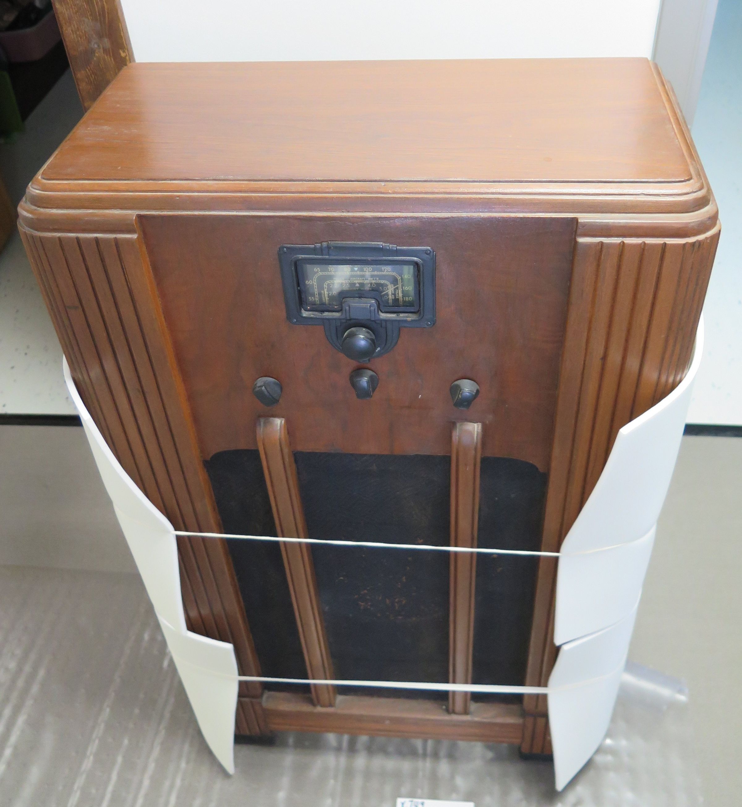 This is a RCA Brand floor model radio with black dials. It is brown wood. The radio measures 37" (h) x 22" (w) x 11" (d). It is possible that this radio is 1997.1.18.
