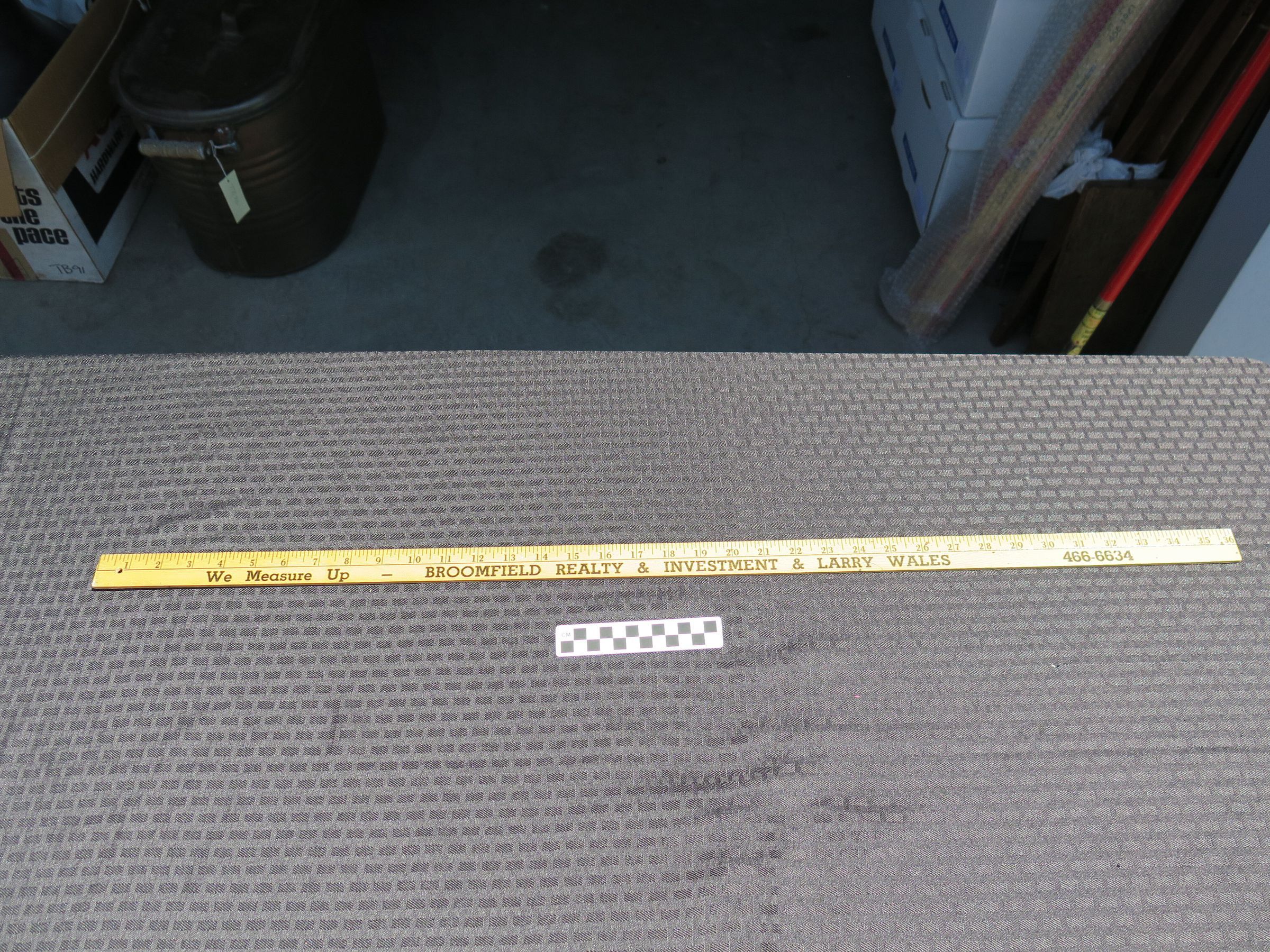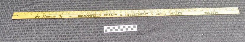 This is a 36" yellow yardstick measuring 36"(L) x 1"(W). Text in black letters reads "Broomfield Realty & Investment & Larry Wales".