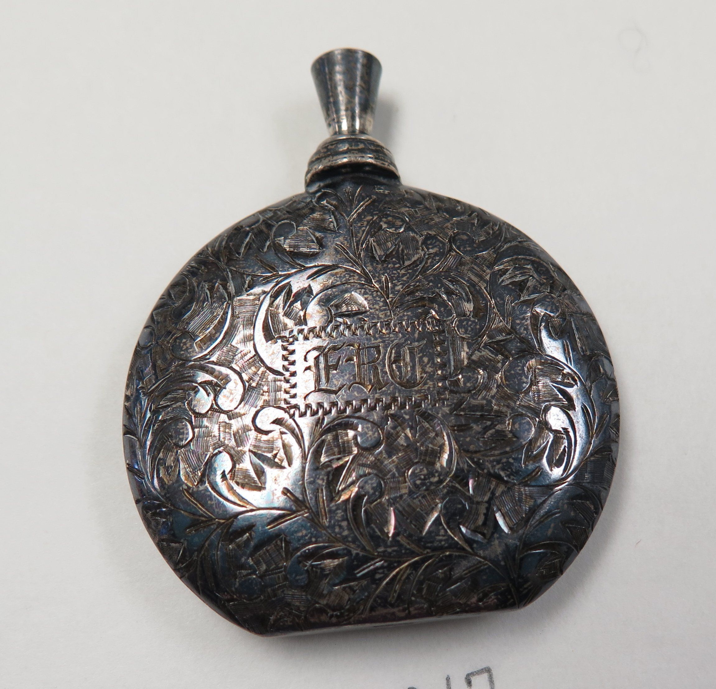 This is an engraved silver perfume container that measures 2.25" (H) x 1.75" (W).