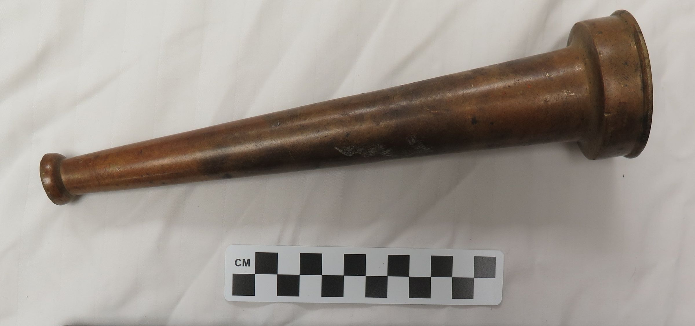 This brass fire hose nozzle measures 10"(L) x 2.5"(Dia).