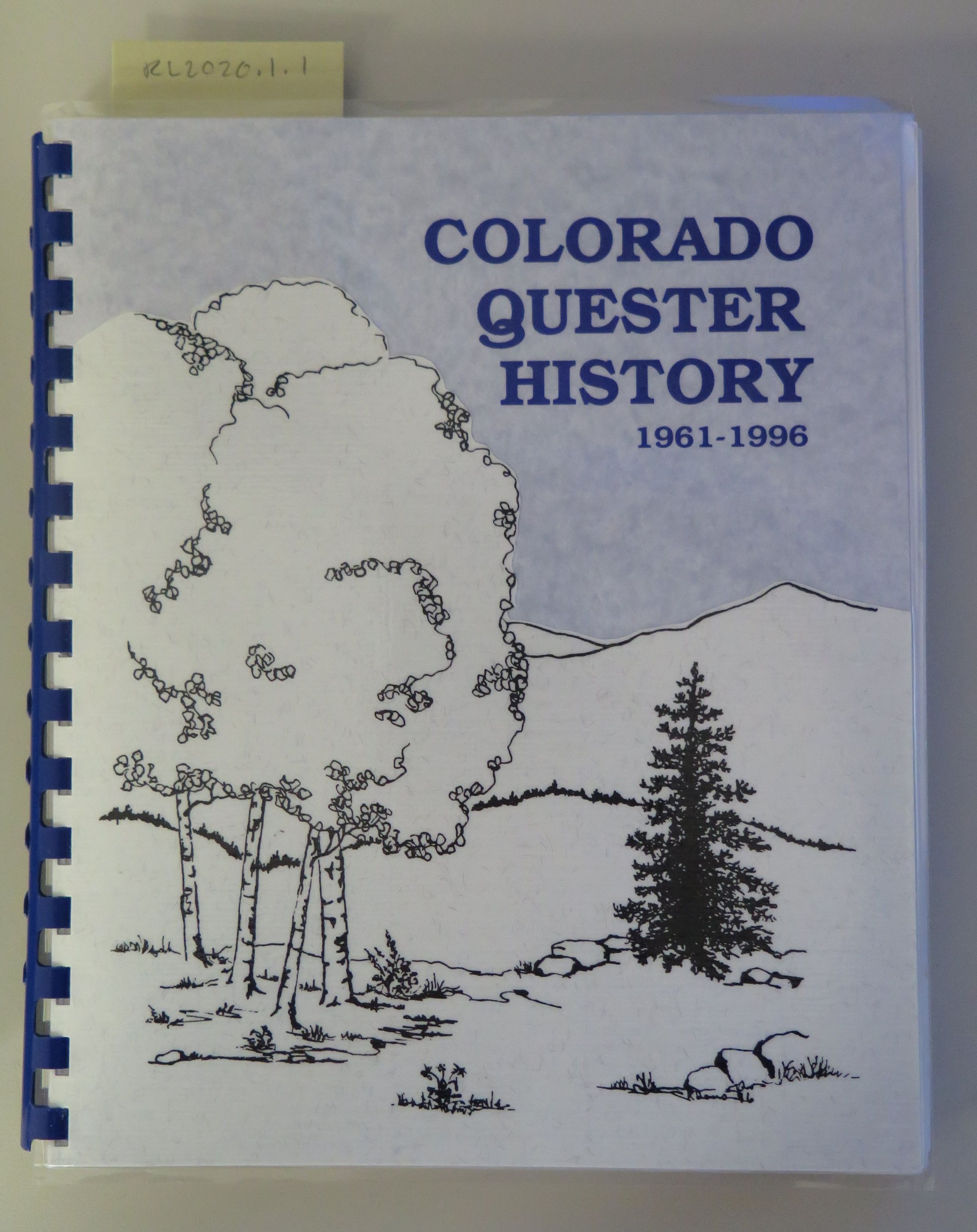 Book, "Colorado Quester History 1961-1996". Signed copy of a limited run (ours is 17/250). Written by Beverly Carrigan, illustrated by Beverly Carrigan, and research done by Carol PAull. A photo and their signatures appear in the back of the book. First page states "First Edition, March 31, 1996 / Lakewood, Colorado." Inside cover has pink post-it note saying "Book #17 / Peggy Atkinson / Chimney Sweeps #225 / Donated to Broomfield Depot Museum / May 9, 1996"Collection