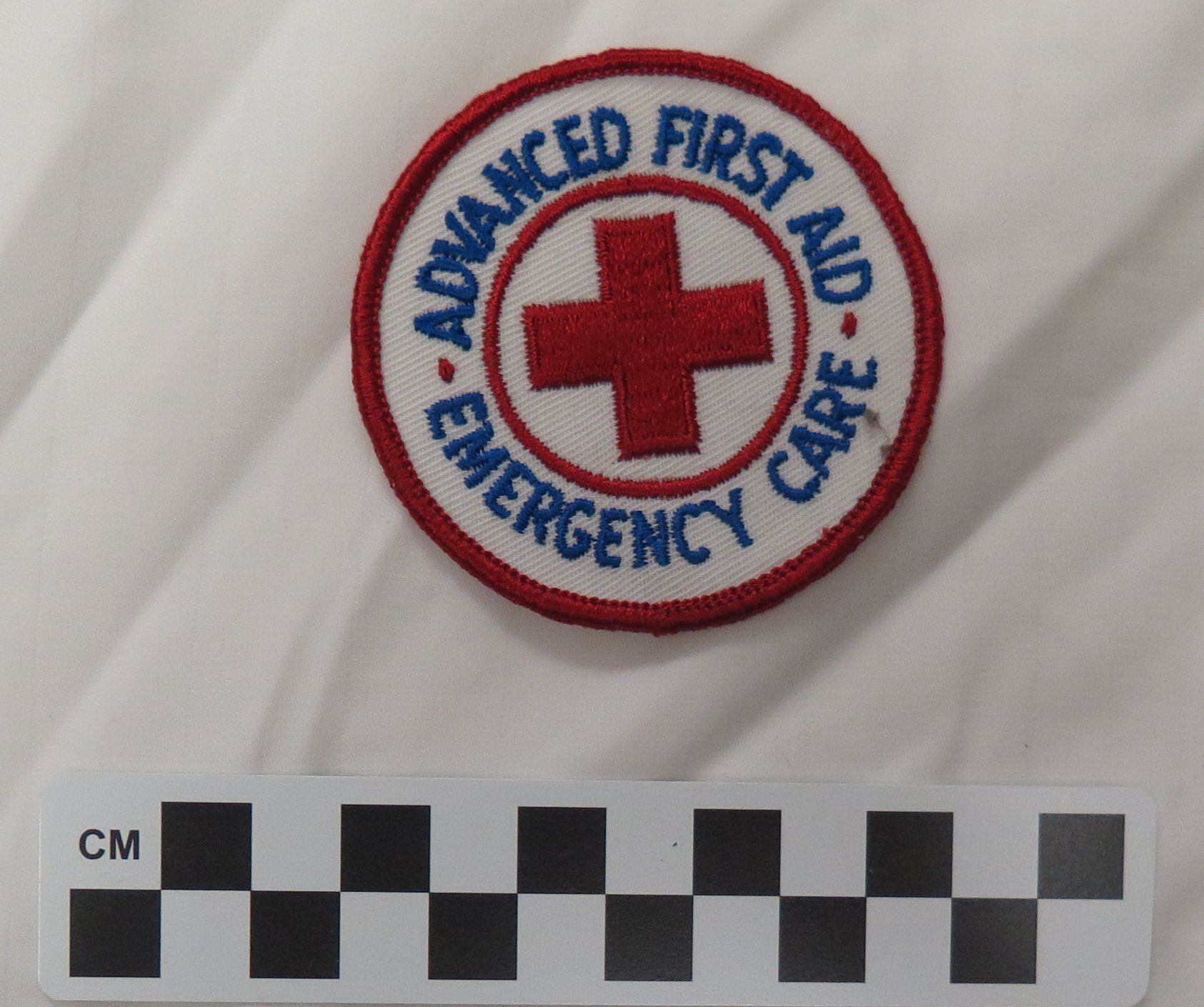 This cloth American Red Cross patch measures 1.25"(Dia.) It reads " Advanced First Aid Emergency Care".