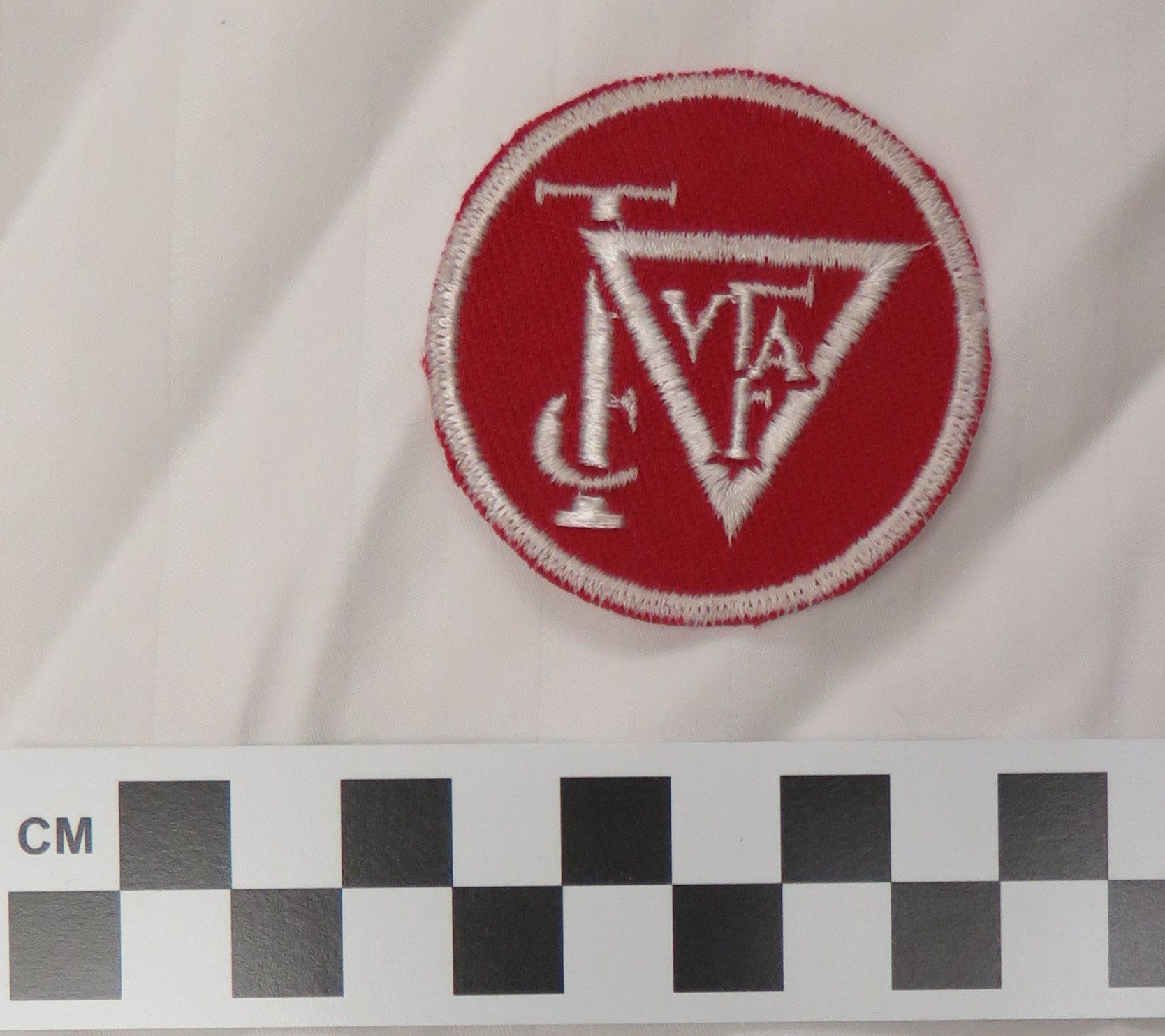 This is a red cloth patch 2"(Dia) with white interlaced letters in the fashion of a cypher symbol.
