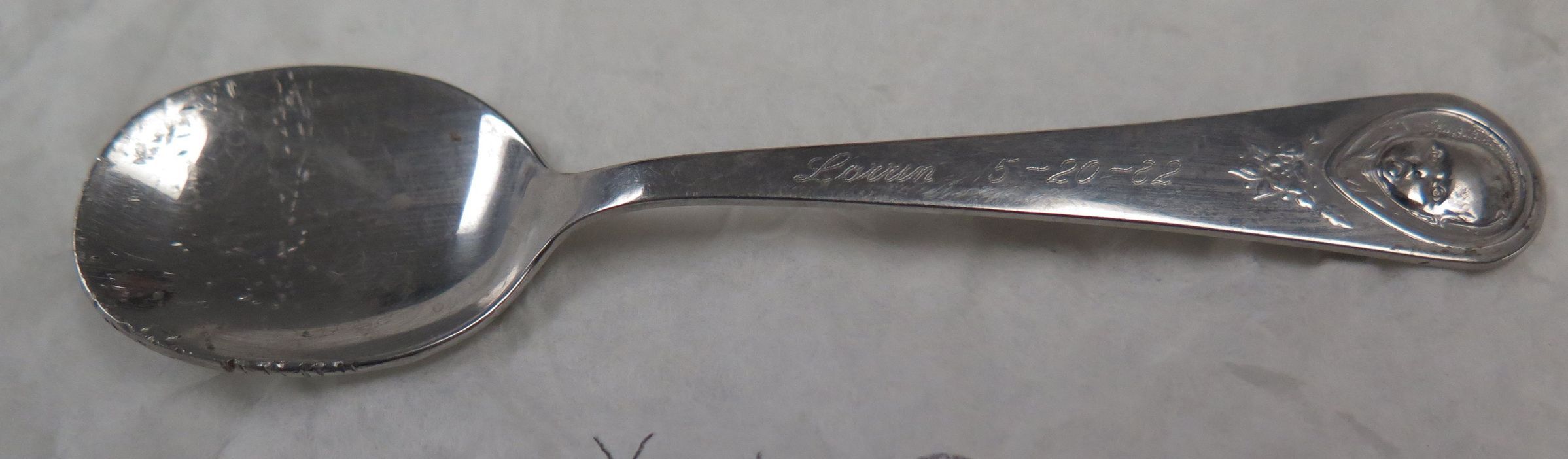 This metal baby spoon 4.5"(L) has a baby face likeness at the end of the handle and on the stem-front side is inscribed: "Larrin 5-20-82".