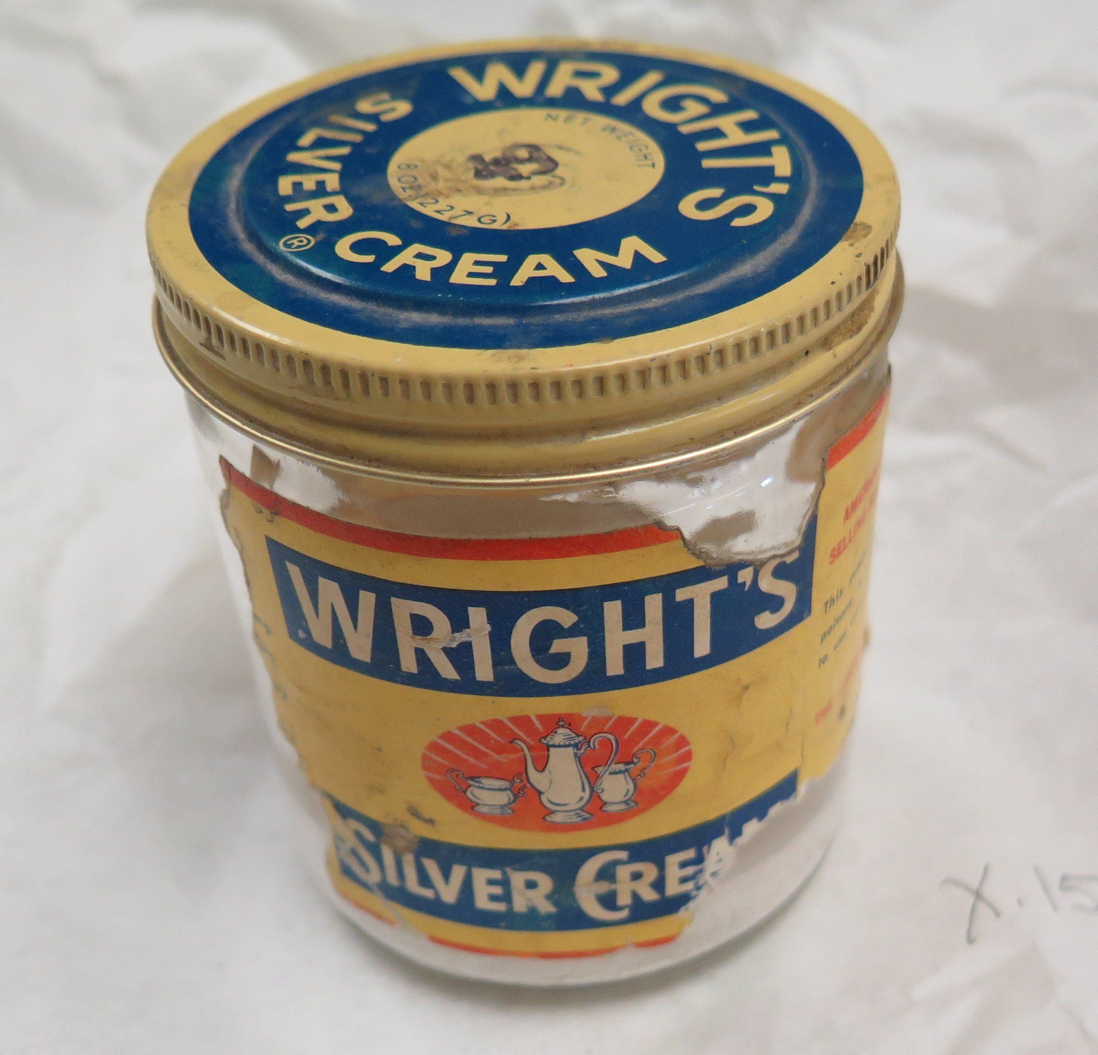 This clear glass jar 2.75"(H) x 3.25"(W) has a yello and blue paper lable which reads "Wright's Silver Cream". It has a blue metal screw-on cap which has the same text in yellow letters.