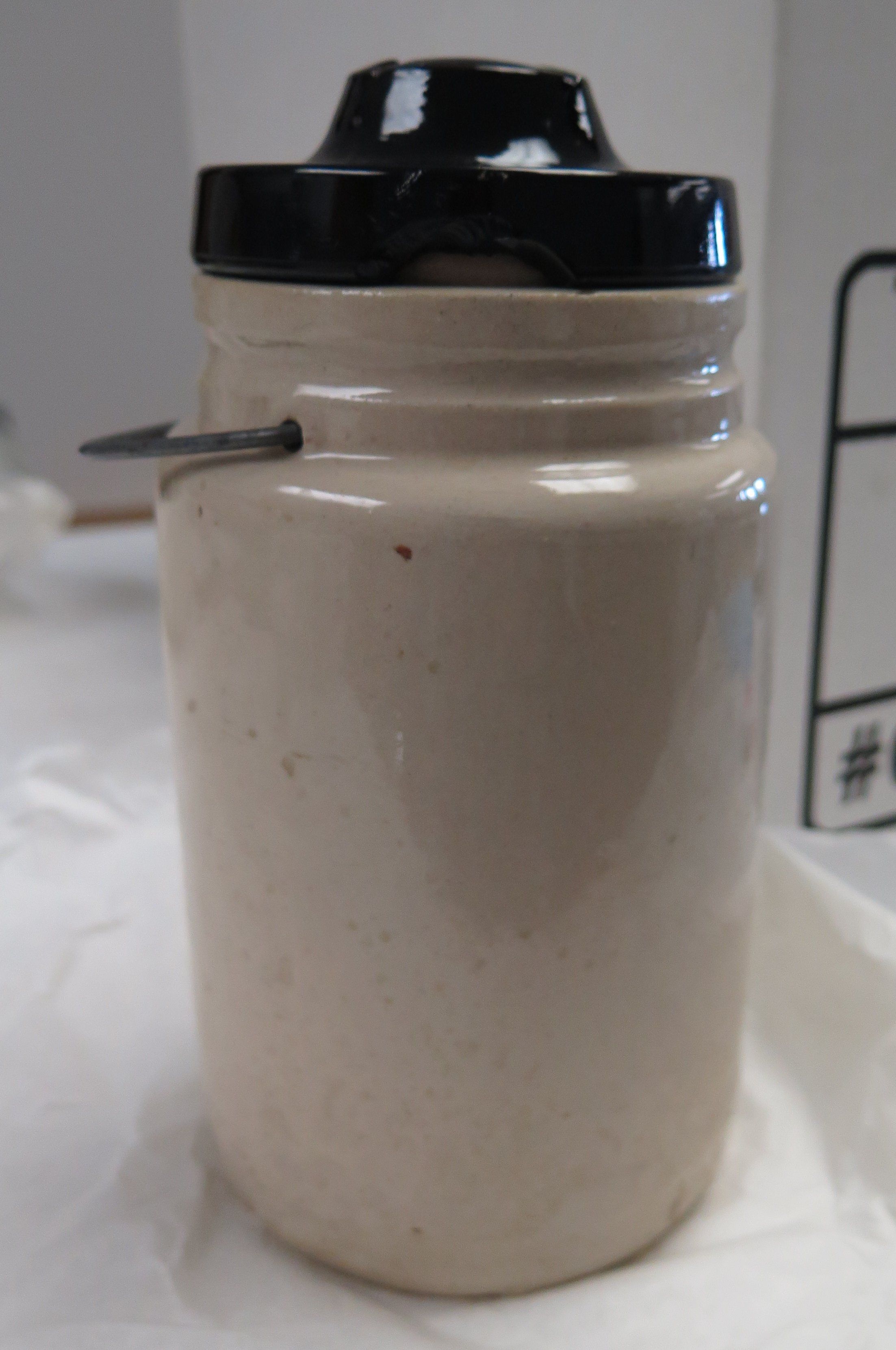 This off-white ceramic crock 7"(H) x 4"(Dia) features an attached metal bale closure and a brown ceramic lid.