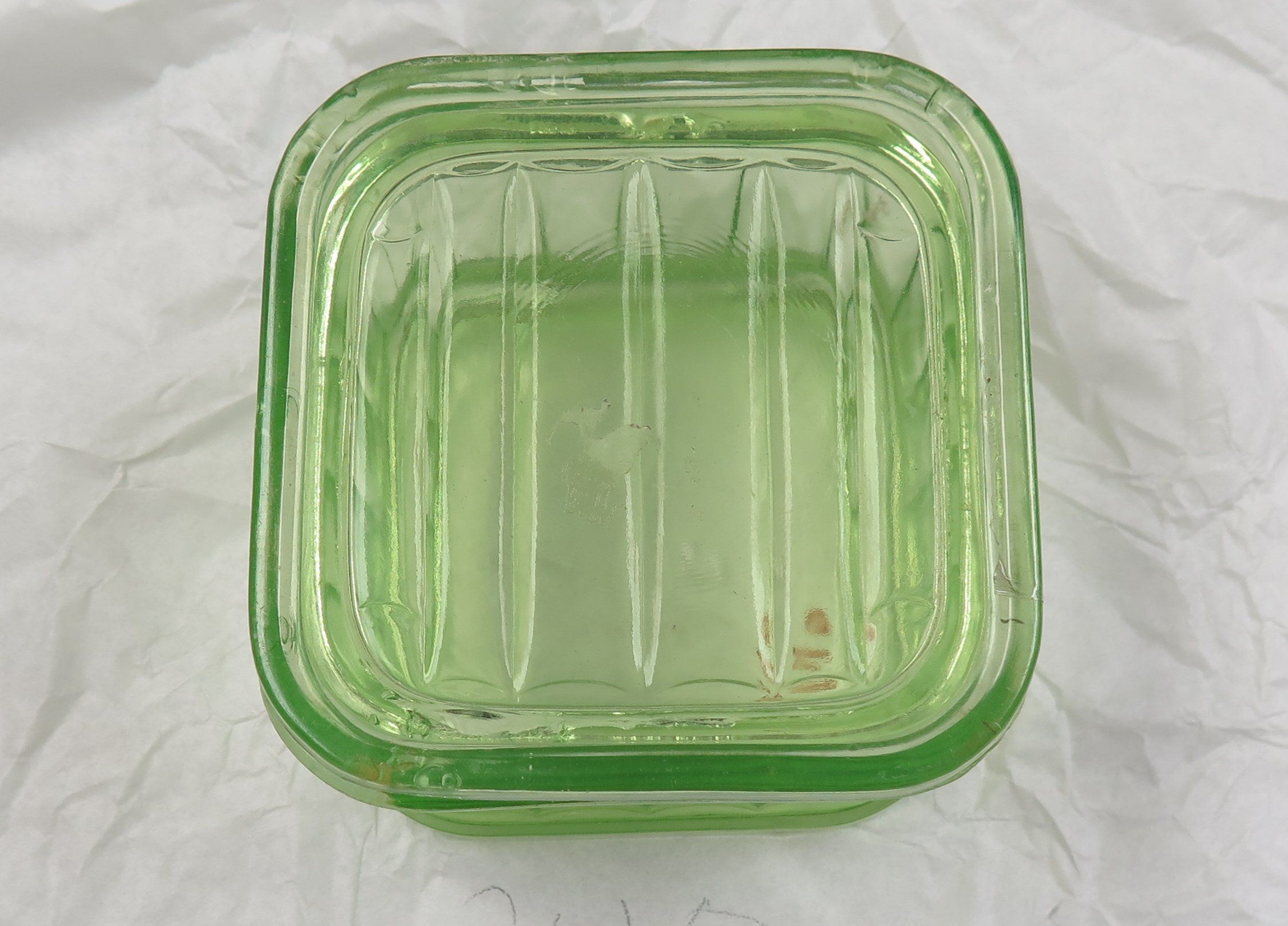 Green moulded glass food container 3"(H) x 4"(W) x 4"(L). This could be an example of"Vaseline" glass.