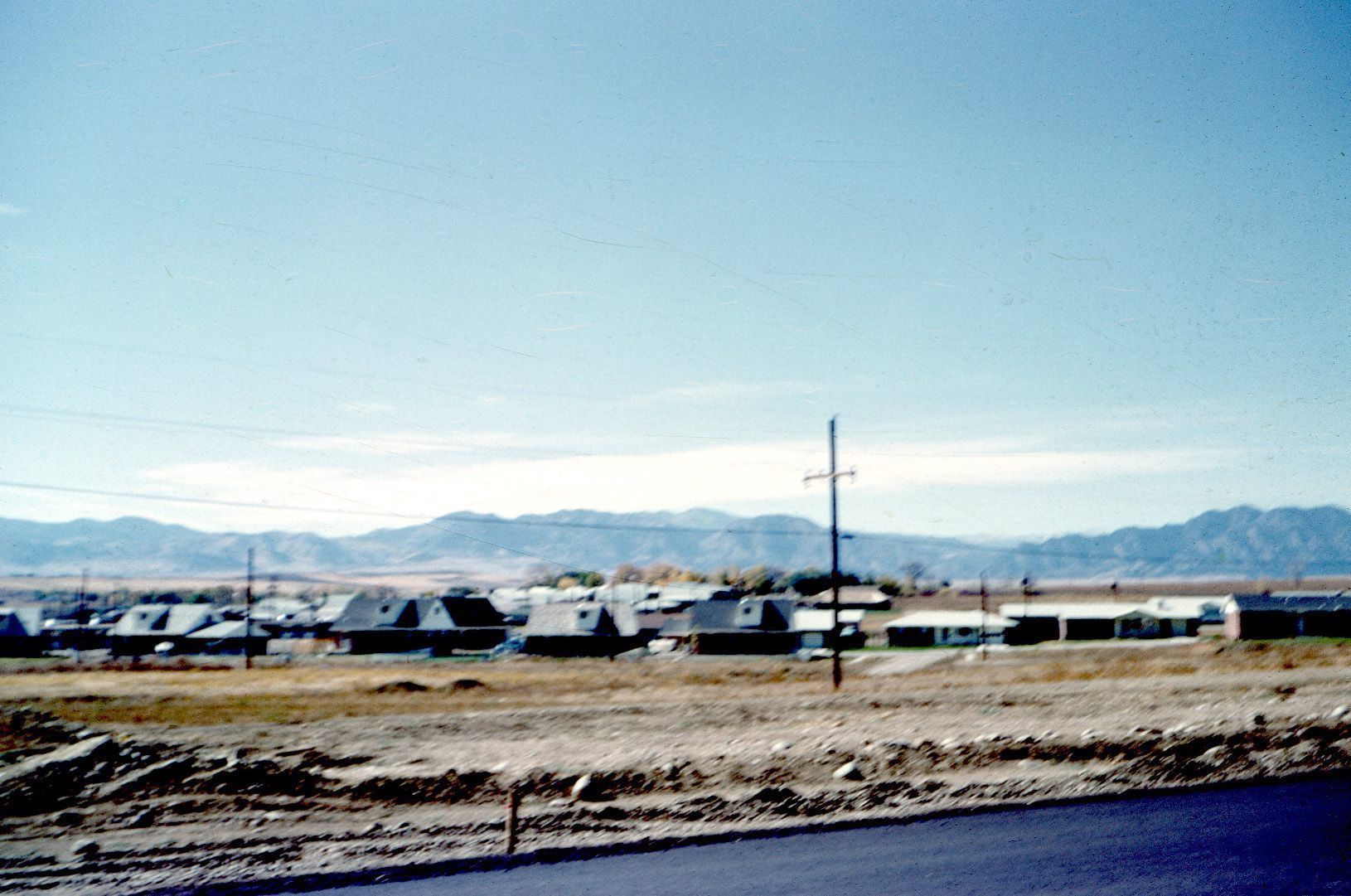 Color photograph of a field, powerlines, and buildings. Photograph was taken while driving either west or northwest. The foothills are in the background. The buildings are mostly houses. Leaves on the trees in the background are turning yellow.