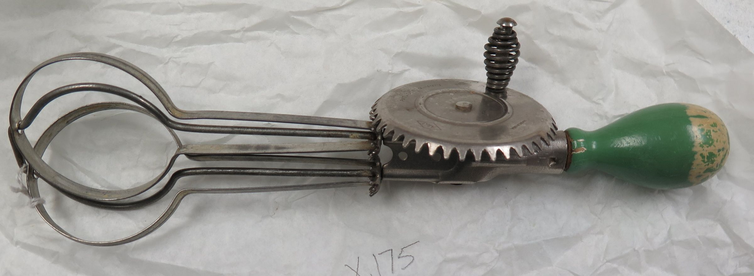 This metal mechanical hand-operated beater 10.5"(L) x 2.5"(W) has a coiled wire crank handle and a green turned wood top handle.