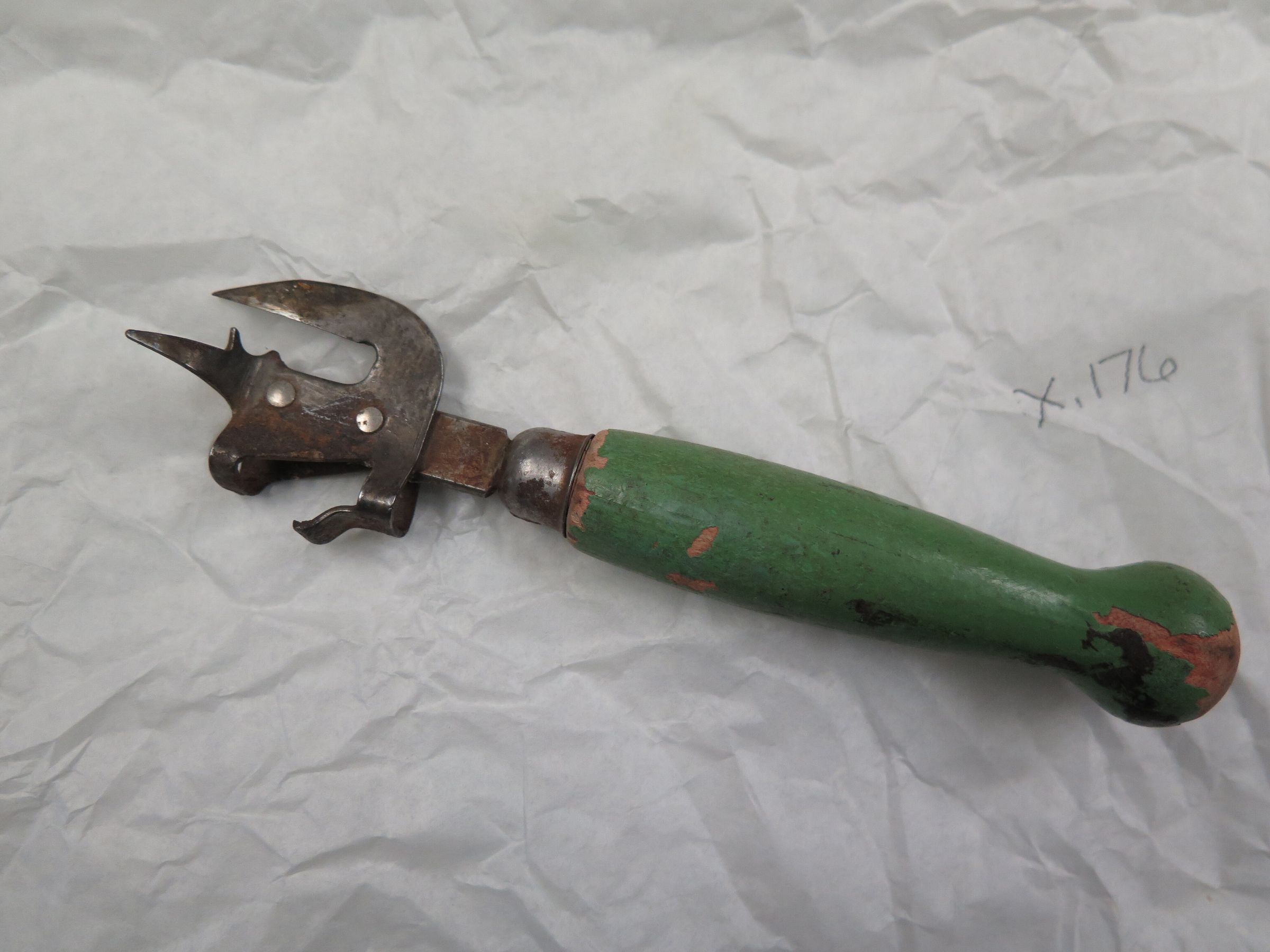 This combination can and bottle opener 6.5"(L) x 1.5"(W) has a green turned wood handle.