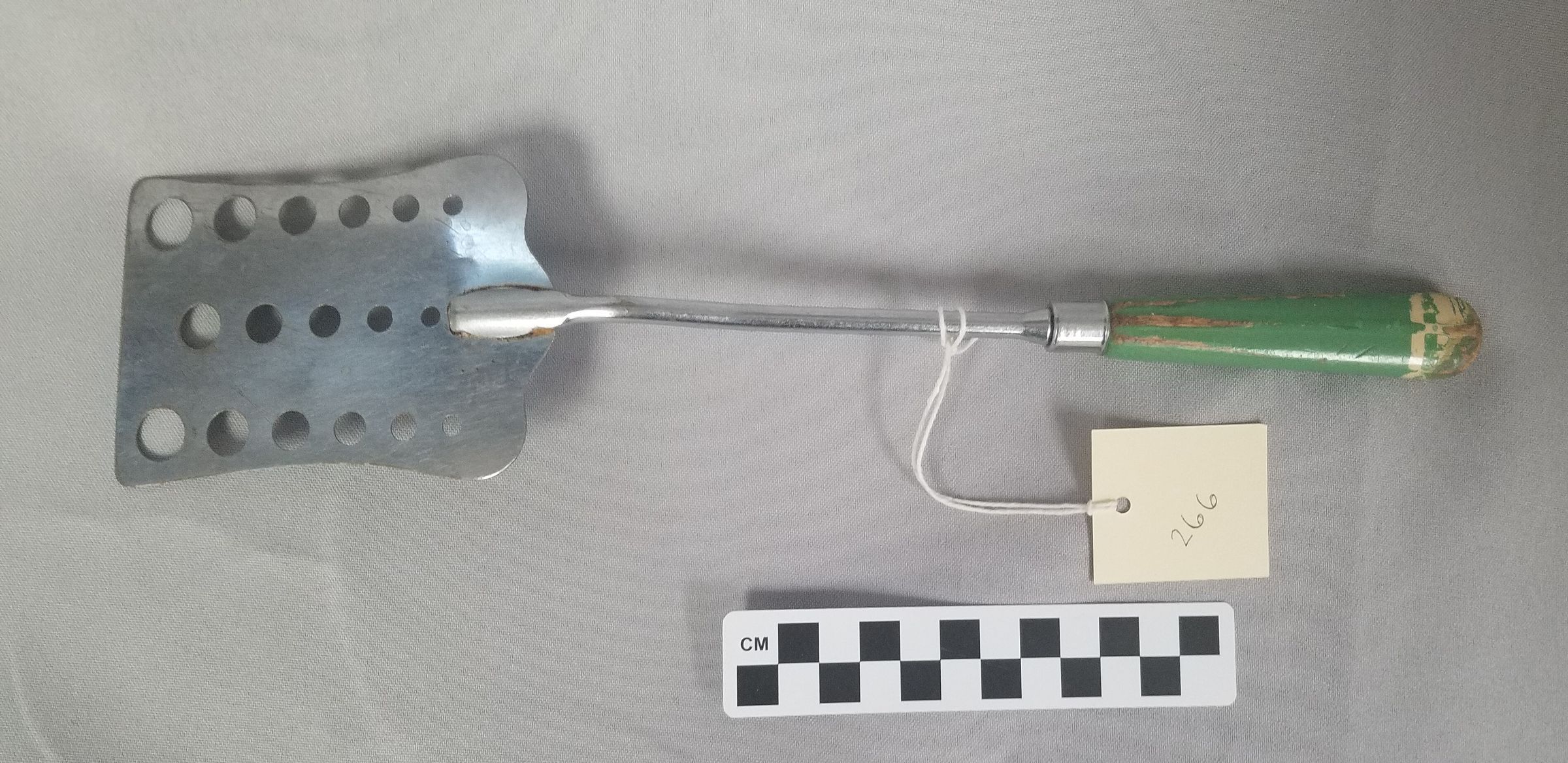 This is a metal kitchen spatula 13.25"(L) x 3"(W) with a teal-green, wooden handle.