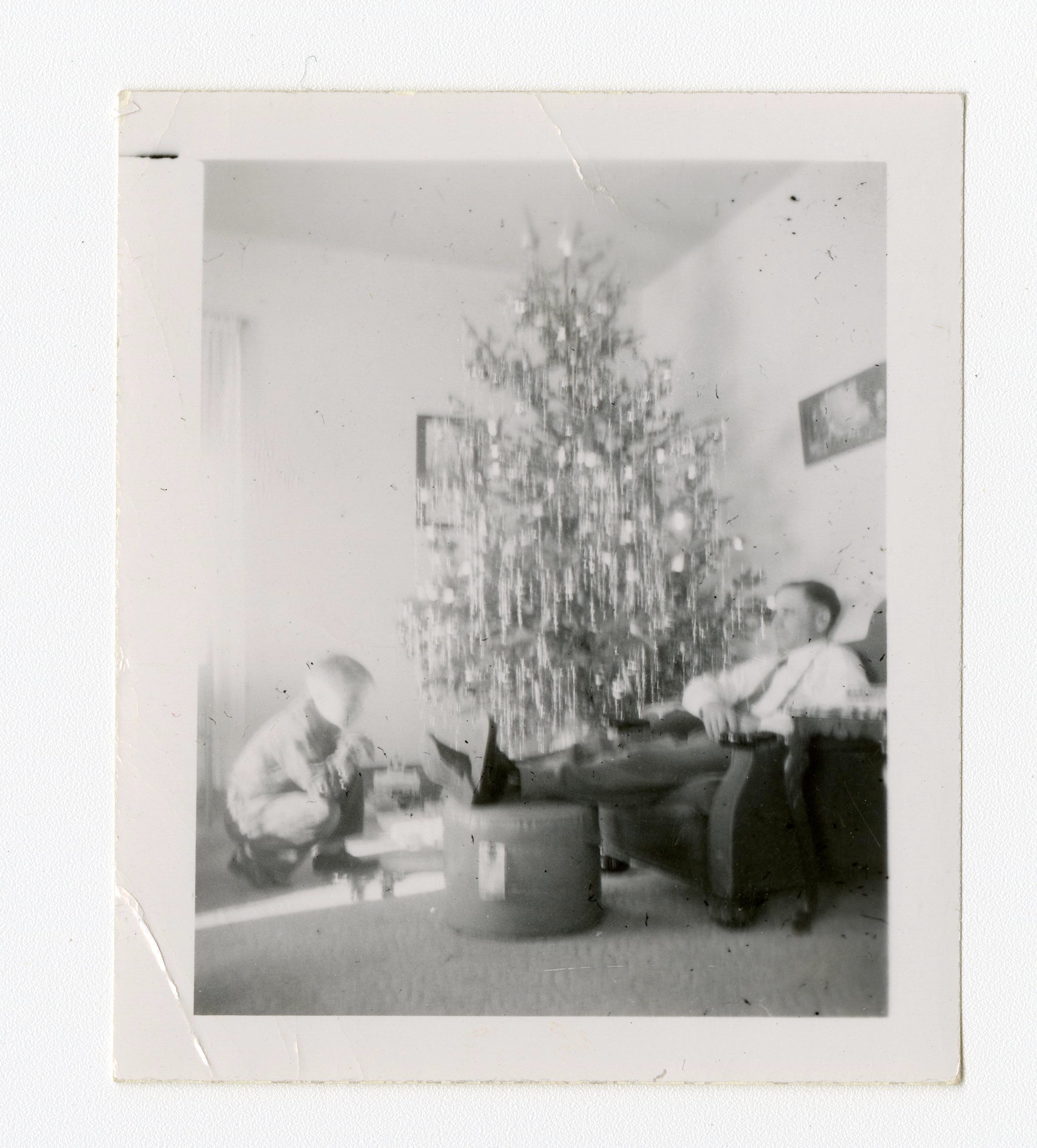 Black and white photograph of two people. The photograph was taken inside. There is a decorated tree in the background. The person on the right probably is either Albert Brunner or Lester C Brunner. The boy is probably Lester C or Lester K. Identities of the people are educated guesses.