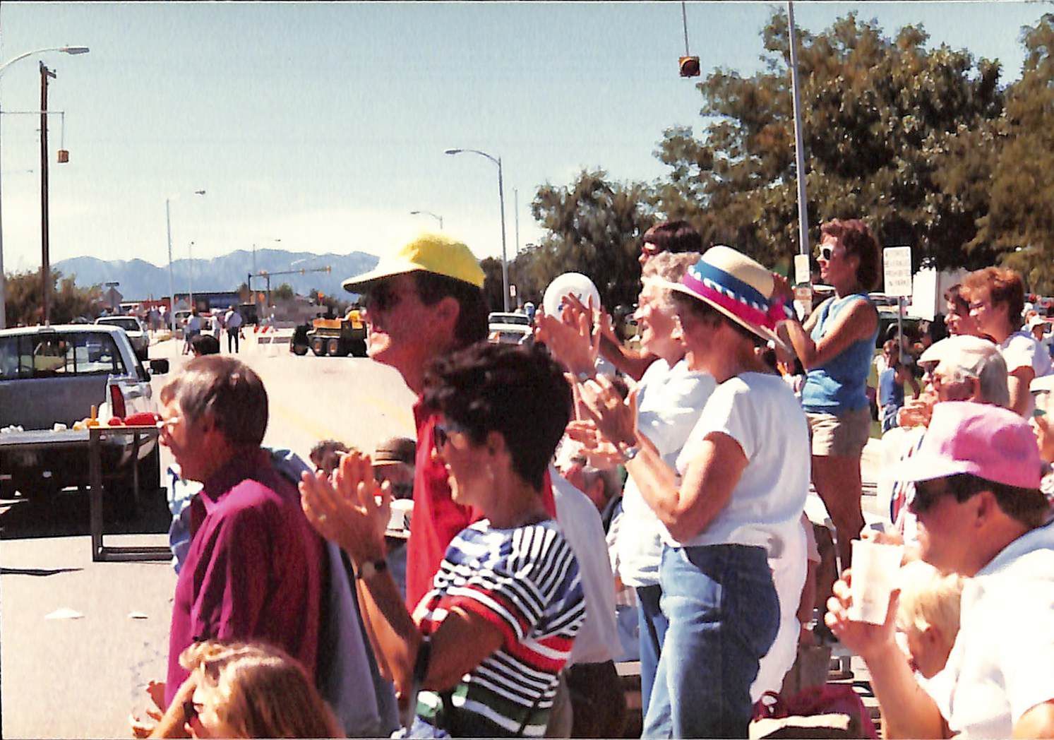 Item is a photograph printed on Kodak paper taken during the 1989 Broomfield Days event. In the photo, Joe and Carol Dankey are shown standing amongst a crowd on the side of the road, most likely watching the parade. Carol is wearing a blue, red, and green striped shirt and sunglasses, and Joe has a red shirt and yellow hat on. Trees, stoplights, and construction vehicles are visible in the background against the mountainous backdrop. Joe and Carol Dankey had began the Broomfield Days poster contest in 1988, the year before this photo was taken, and continued to run it until 2008.Photograph Details
