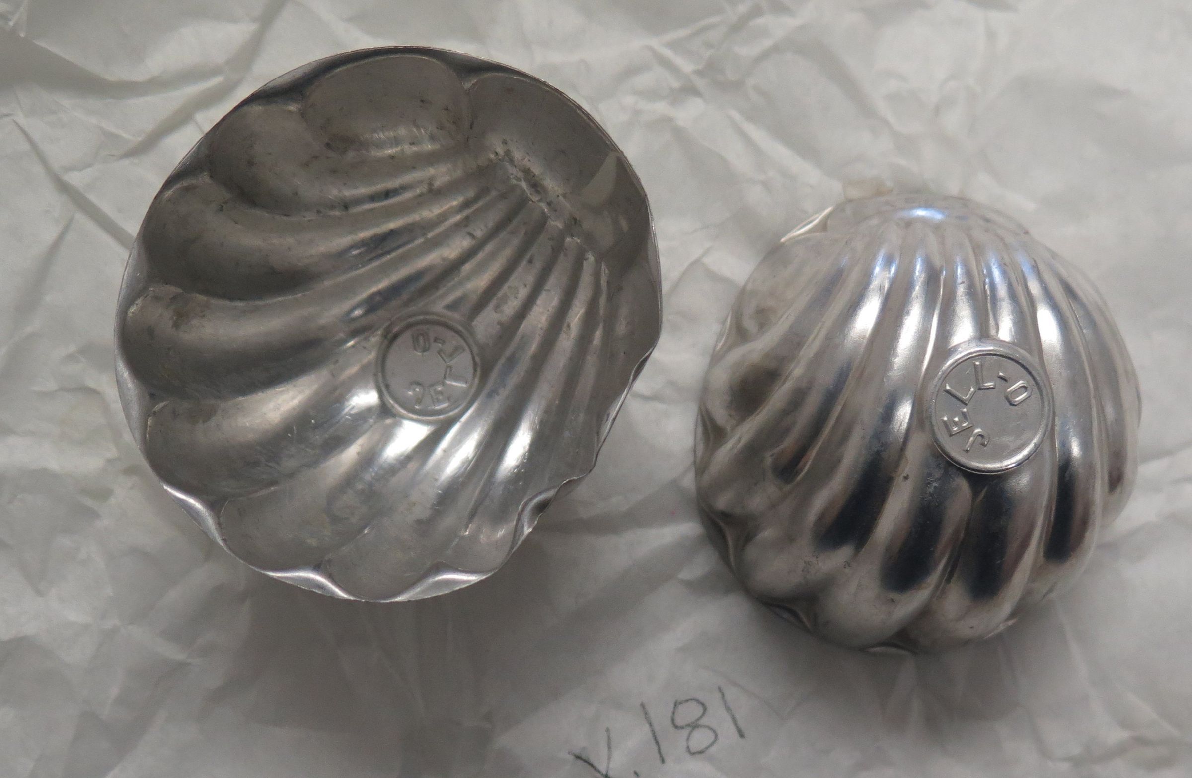 This is a set of two metal gelatin molds 2"(H) x 2.75"(Dia.) They are silver in color and are shaped like sea shells. Within a raised embossed circle on the top of the molds is the text JELL-O. Note: These are likely 1996.11.4 (TTempleman 12/01/2017)