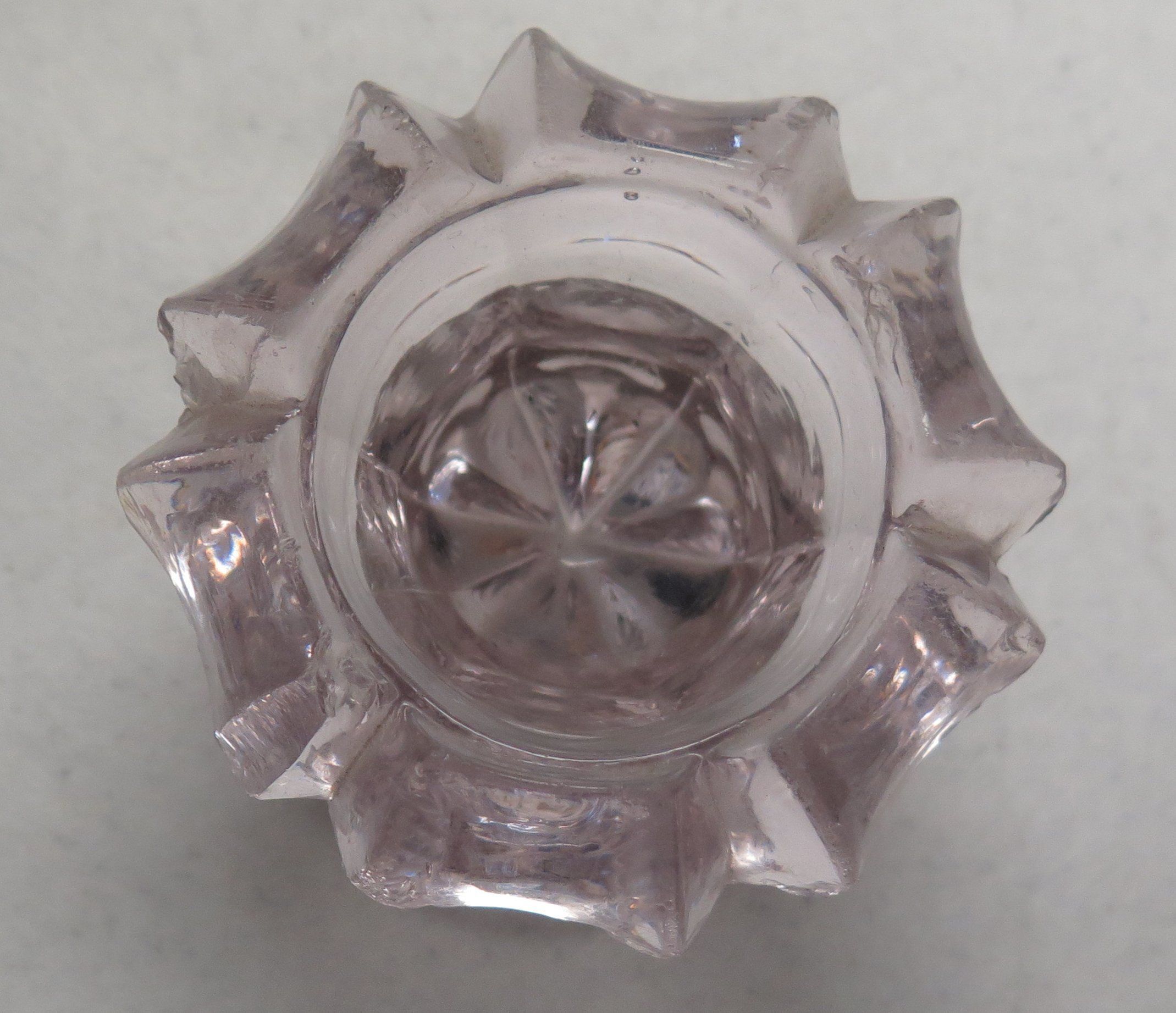 This is a purple molded glass votive style candle holder 2.25"(H) x 3.5"(W).