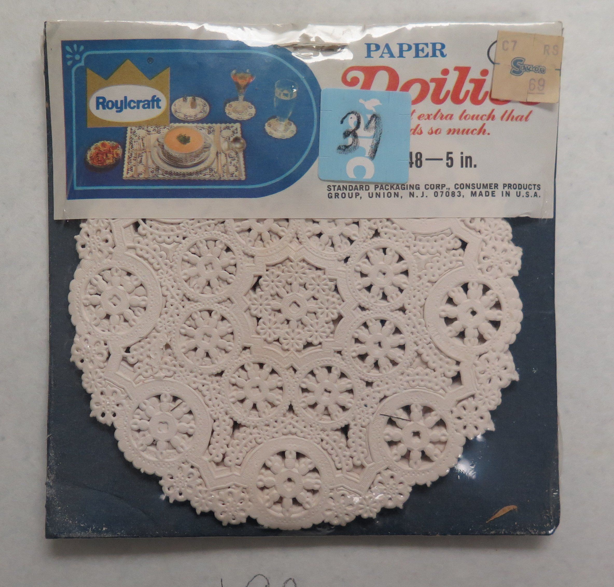 This is an unopened celophane and cardboard packet of "Royalcraft" paper doileys. 5.5"(H) x 5.75"(W).