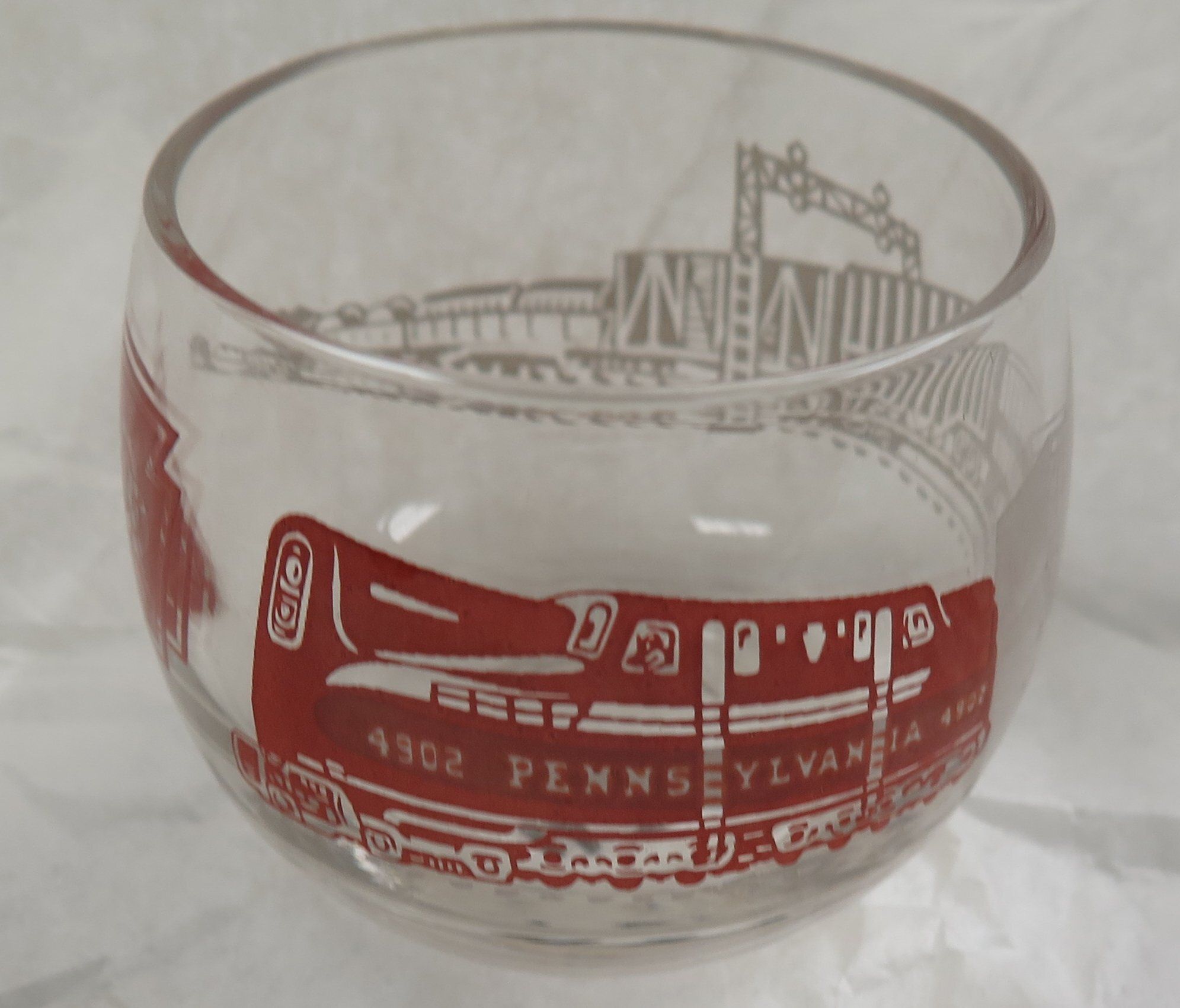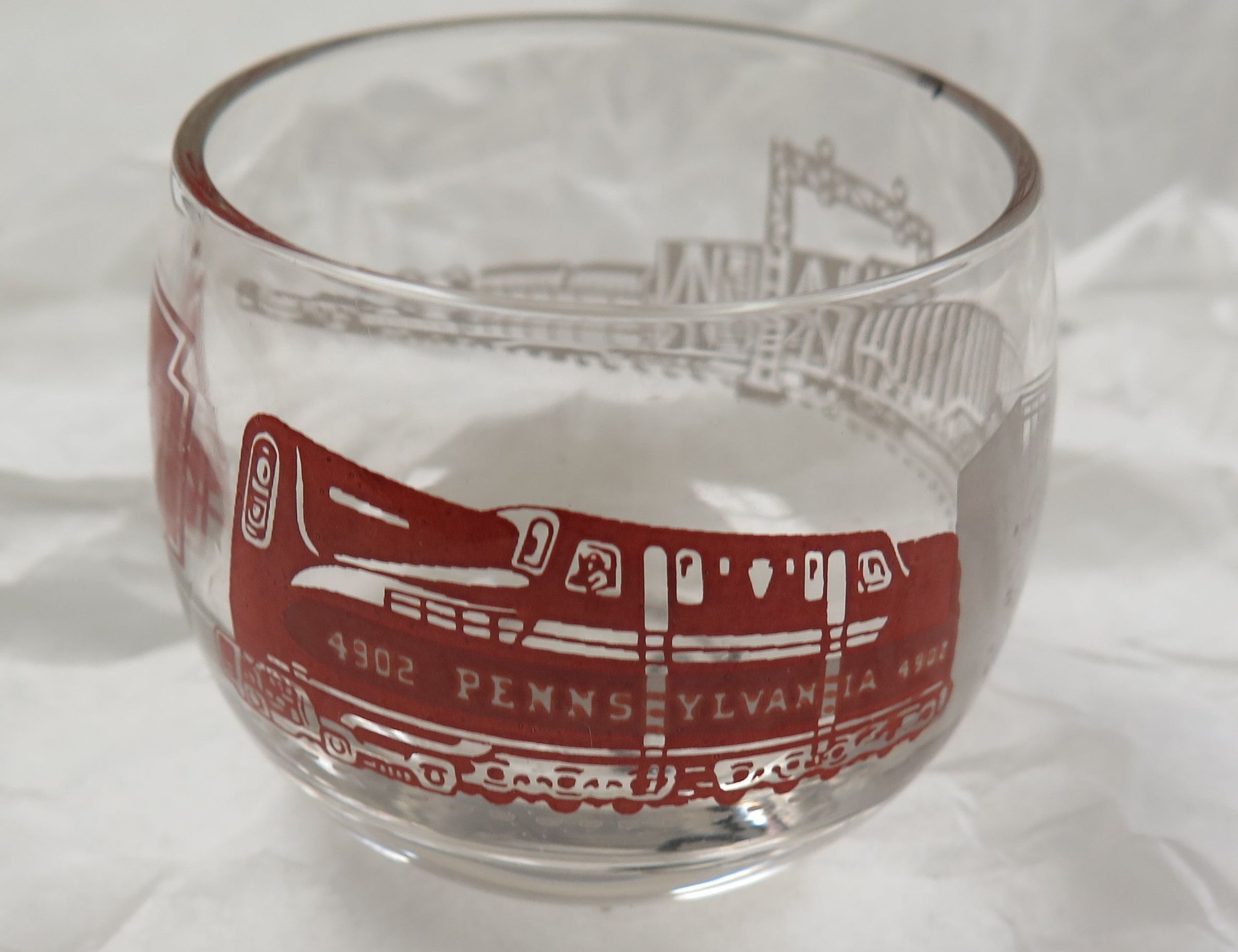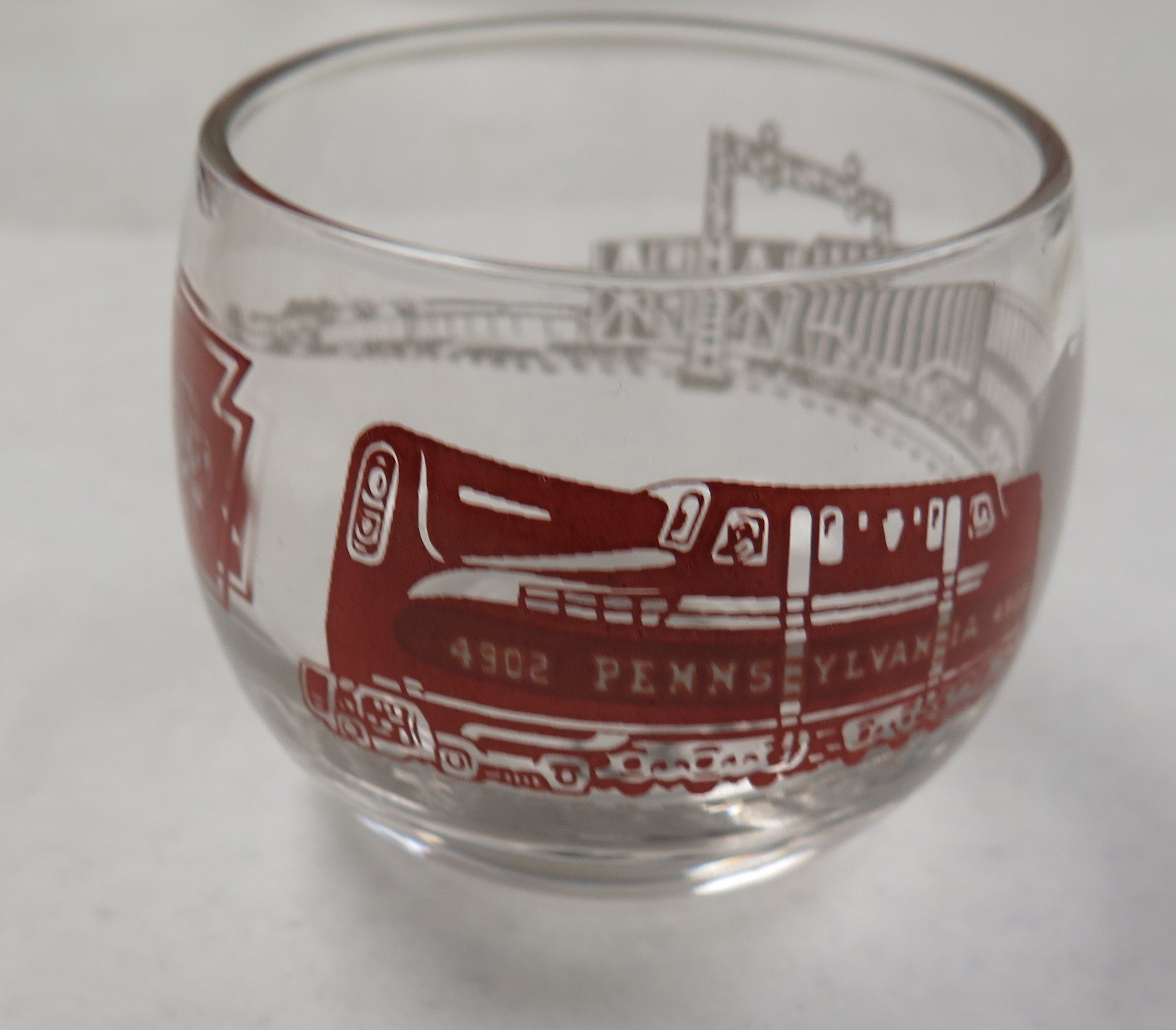 This is a set of three "high ball" or "Rocks" glass 2.5"(H) x 2.5"(Dia.) featuring a Pennsylvania Railroad train scene.