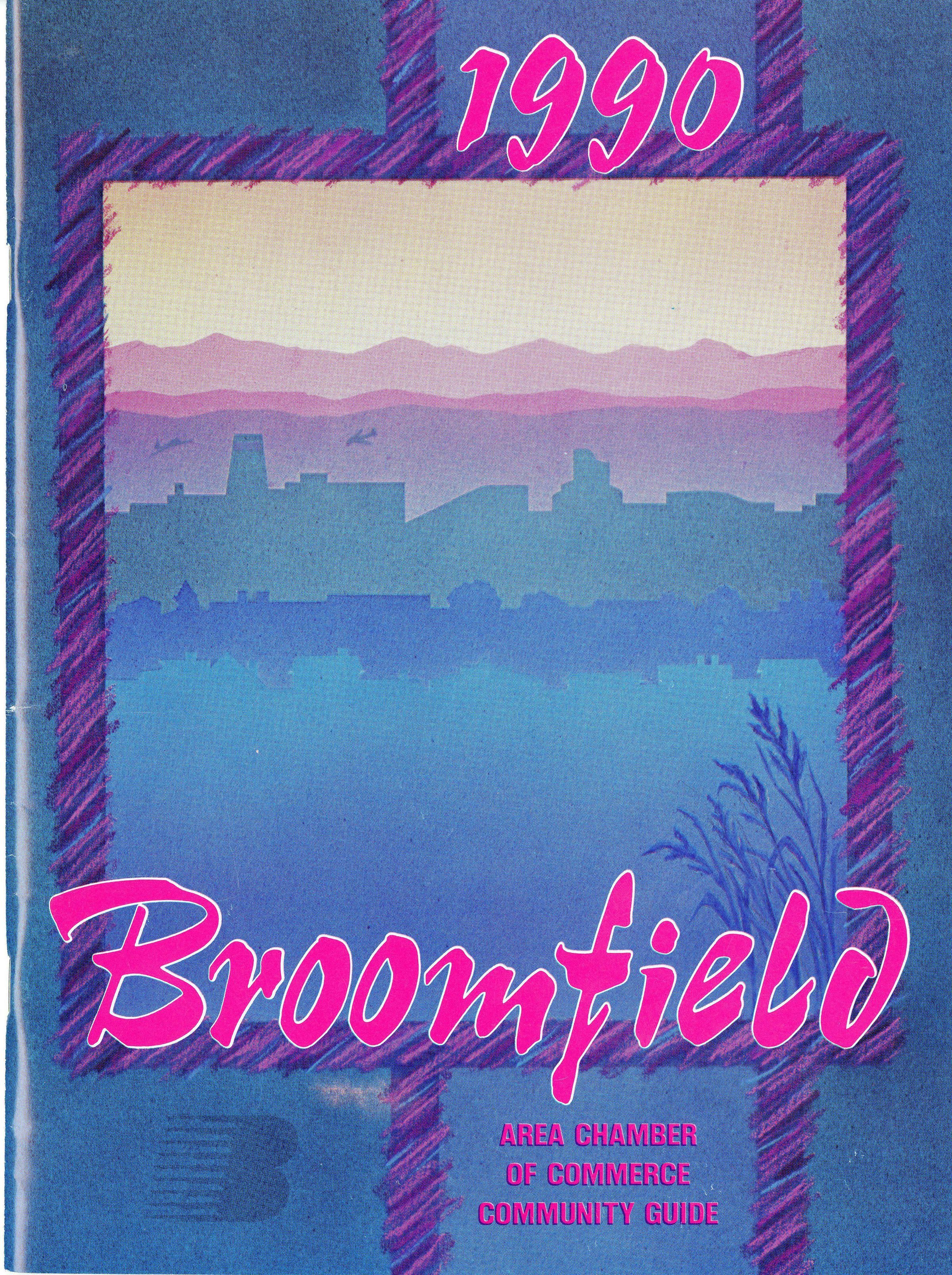 1990 Broomfield Area Chamber of Commerce Community Guide. Glossy cover with pink, blue, and purple landscape and neon pink lettering. Magazine-like design with newspaper paper type pages. Includes directory of city service phone numbers and "blue pages" businesses. Includes graphs and information about population growth, household units, employment, and water availability. Also explains and outlines. Contains many ads for Broomfield businesses.Collection