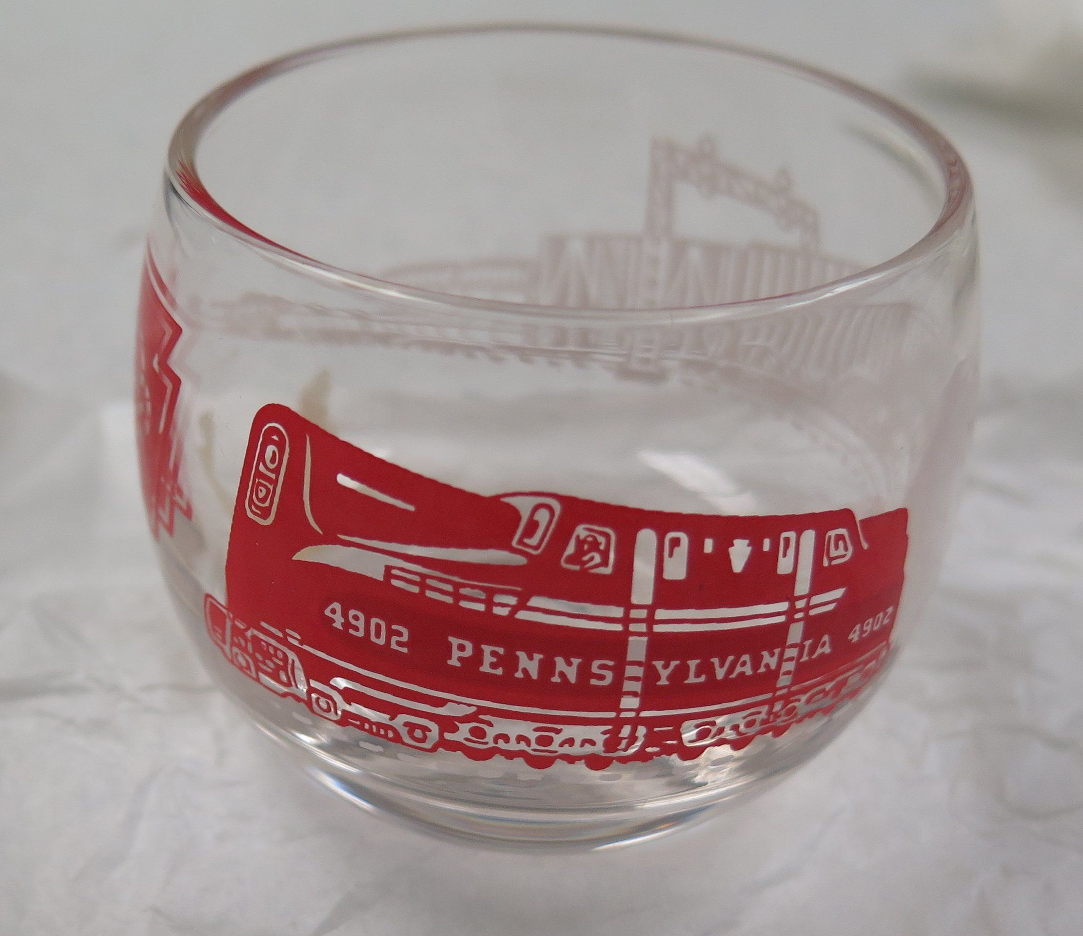 This is a clear "High Ball or "Rocks" glass 2.5"(H) x 2.5"(Dia) that features a Pennsylvania Railroad train scene.