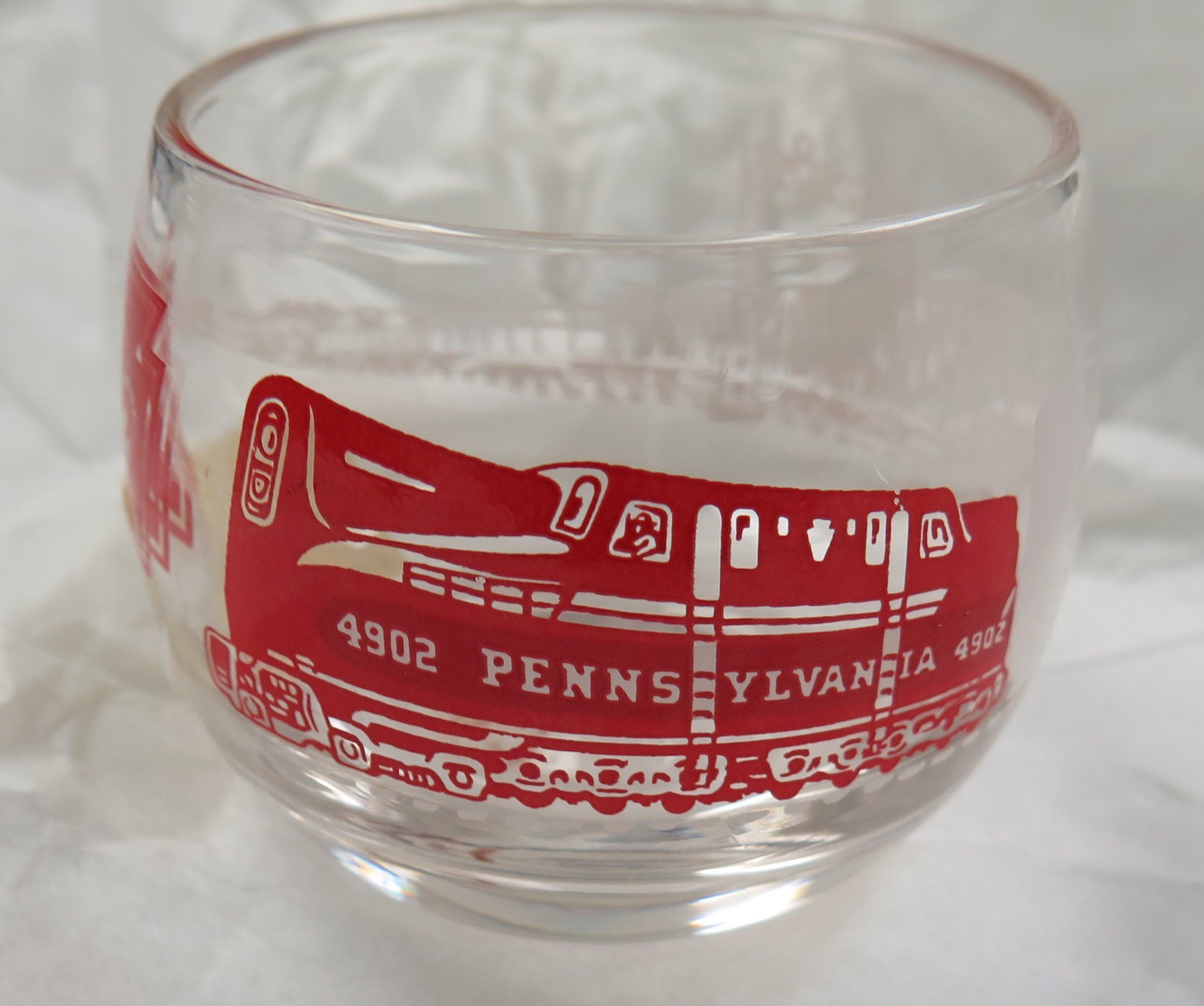 This is a clear "High Ball or "Rocks" glass 2.5"(H) x 2.5"(Dia) that features a Pennsylvania Railroad train scene.